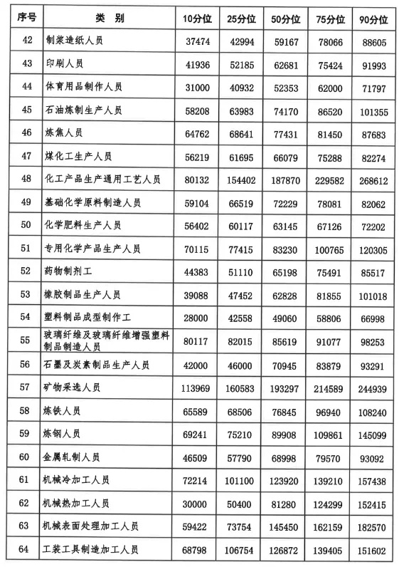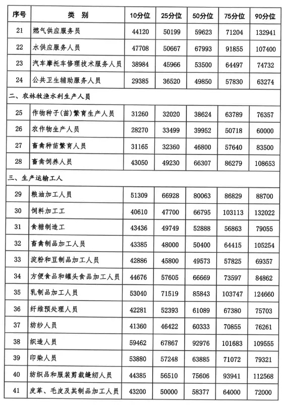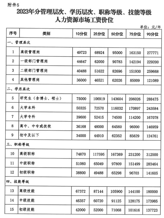 一、本次发布的2023年人力资源市场工资价位共计166个,包括五个类别:一是按行业分类的工资价位18个;二是按管理和技术类职业分类的工资价位34个;三是按技能类职业分类的工资价位87个;四是数字职业工资价位12个;五是按管理层次、学历层次、职称等级、技能等级分类的工资价位15个。
