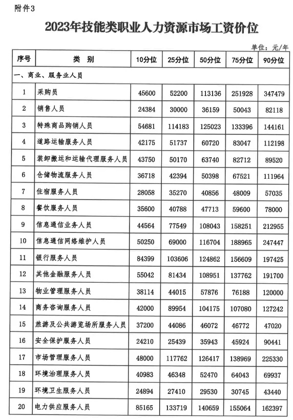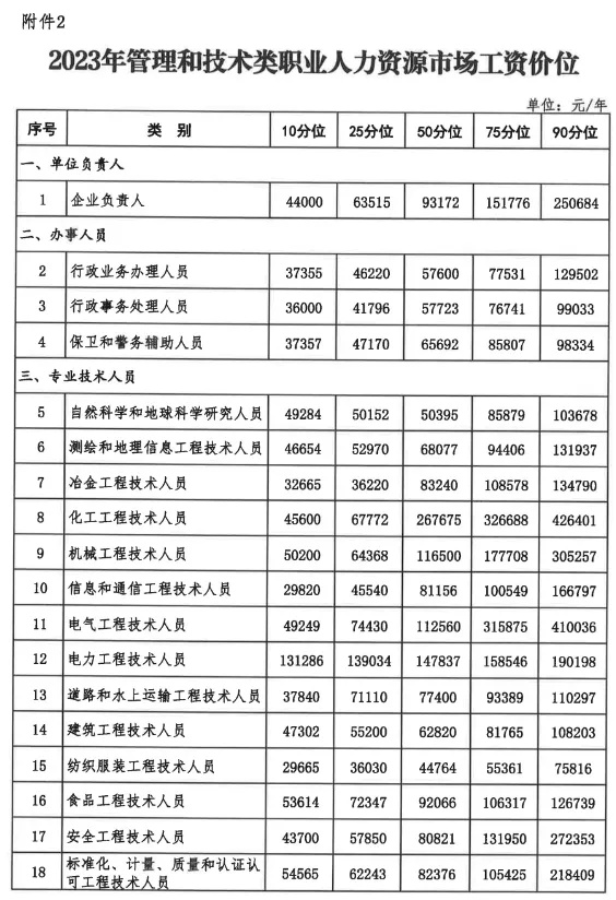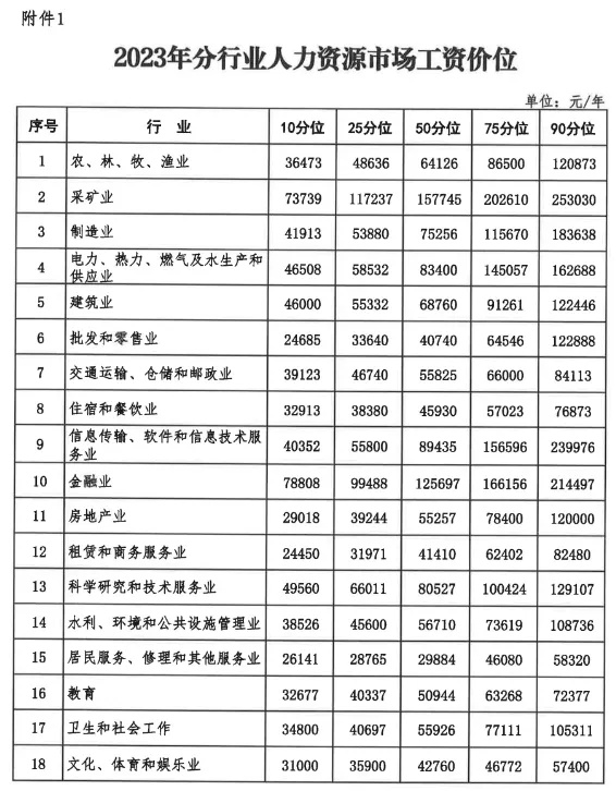 为充分发挥工资价位对企业工资分配的指导作用,引导企业进一步完善职工工资收入分配机制,加强企业技能人才薪酬分配的指引,经过对2023年全市18个行业门类502户企业66459名职工的2023年度工资收入情况进行调查汇总,形成了我市2023年人力资源市场工资价位,现予以发布并就有关事项通知如下: