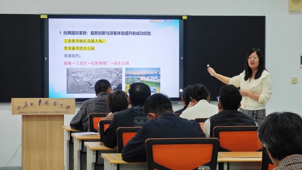 本次“外语+旅游”培训班为期两天,课程内容涵盖国际交流礼仪、入境旅游服务、数智营销策略以及文旅融合等多个方面,旨在深化跨文化交际,探索入境游服务新路径,提升国际接待能力与跨文化沟通技巧,以推动威海市旅游业的高质量发展。期间,张建威教授探讨了跨文化交际的核心地位与复杂性,强调涉外礼仪在文化和政治中的重要性。于亚琦副教授随后阐述了入境游服务的现状和挑战,指出传统服务的瓶颈,并提出优化路径。赵俊明副教授讨论了数字技术对旅游营销的影响,强调整合资源、利用新媒体和数据驱动精准营销的必要性。孔海燕教授分析了中国入境游现状和山东省的接待情况,讨论了改进措施。张钰媛老师则聚焦于旅游行业中英语应用的问题,旨在提高沟通效率和文化传递的准确性。