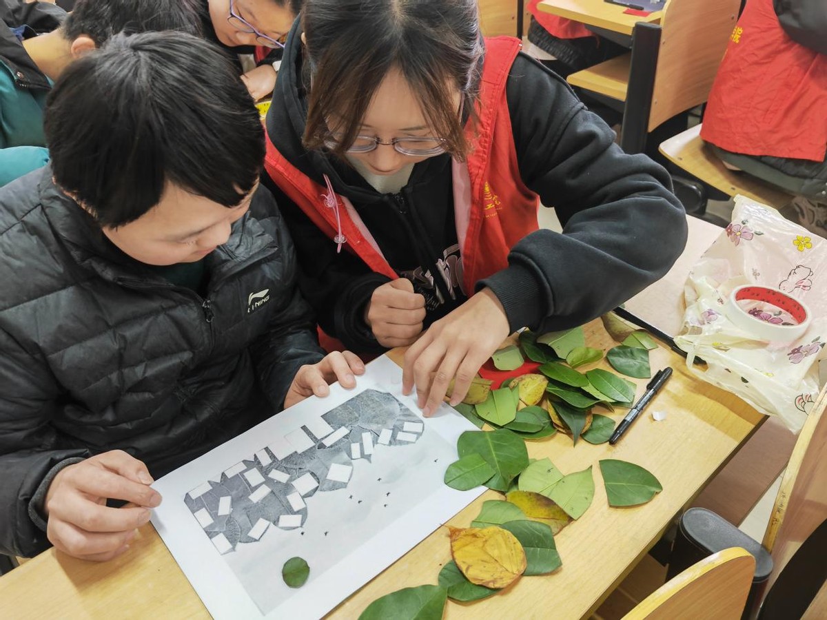 研学第二站,前往德润楼A105教室开展落叶拼贴画活动,特教班的学生们在学校老师和志愿者的耐心指导下,充分发挥自己的想象力,用形状各异的树叶、彩纸等材料拼贴出了一幅幅充满创意的作品。有的学生拼贴出了美丽的风景,有的则展现了可爱的小动物,每一幅作品都凝聚着他们的用心与努力。