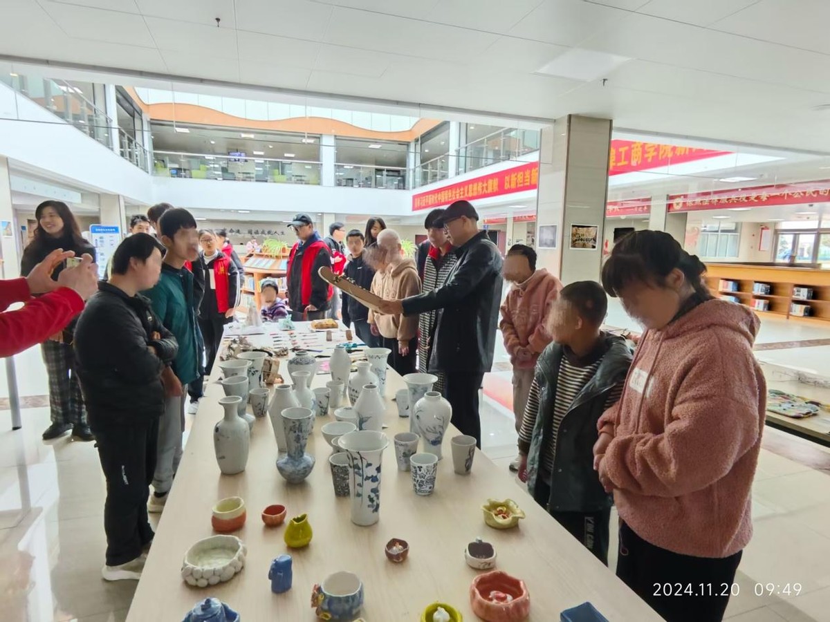 研学第一站,特教班学生在大学生志愿者的带领下重点参观了图书馆及大学生作品展。首先,为了让孩子们更好地了解图书馆,志愿者们耐心地向他们介绍图书馆的布局和设施、展示图书的分类和摆放规律、书籍的借还流程以及书籍消毒设备的使用。随后,学生们来到了大学生手工作品及绘画展区。这里陈列着各式各样巧夺天工的手工作品,有精美的剪纸、别致的陶艺、细腻的针织品等等。每一件作品都展现了大学生们的无限创意和精湛技艺。大学生志愿者们为福利院的孩子们详细讲解每件作品的创作思路和制作过程,孩子们听得津津有味,不时发出惊叹和赞美之声。有的孩子还与大学生们交流互动,表达了自己对手工艺的喜爱和对未来的憧憬。