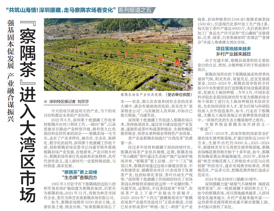 经过多年培育和援藏干部的持续付出,察隅农场茶产业初具规模。近期,察隅农场“雪山藏韵”茶叶通过生态原产地产品保护现场评审,“察隅茶”更上层楼 。自“十三五”规划以来,察隅农场通过边境小康建设资金、中央衔接资金、援藏资金项目10余项用于发展茶产业,包括标准化茶园、茶叶自动生产线等。“深圳第十批援藏工作组刚好经历了农场茶园从种植到采摘收获这样一个关键时期。”冯建军说。这期间,不仅茶园迎来“丰收”,农场茶产业上下游产业链也全面铺开。2022-2024年“十四五”援藏规划项目“察隅农场茶产业提升改造项目”正稳步推进,目前已初步形成茶叶“种植-加工-销售”全产业链条,农场种植茶田2168亩(规模采摘茶园1500亩),引进现代化茶叶加工生产线2条,每天加工茶叶产量达8000斤,先后获批茶叶加工厂食品生产许可证和“雪山藏韵”注册商标,红茶、绿茶、白茶参展深圳“农博会”“食博会”并进入粤港澳大湾区市场。