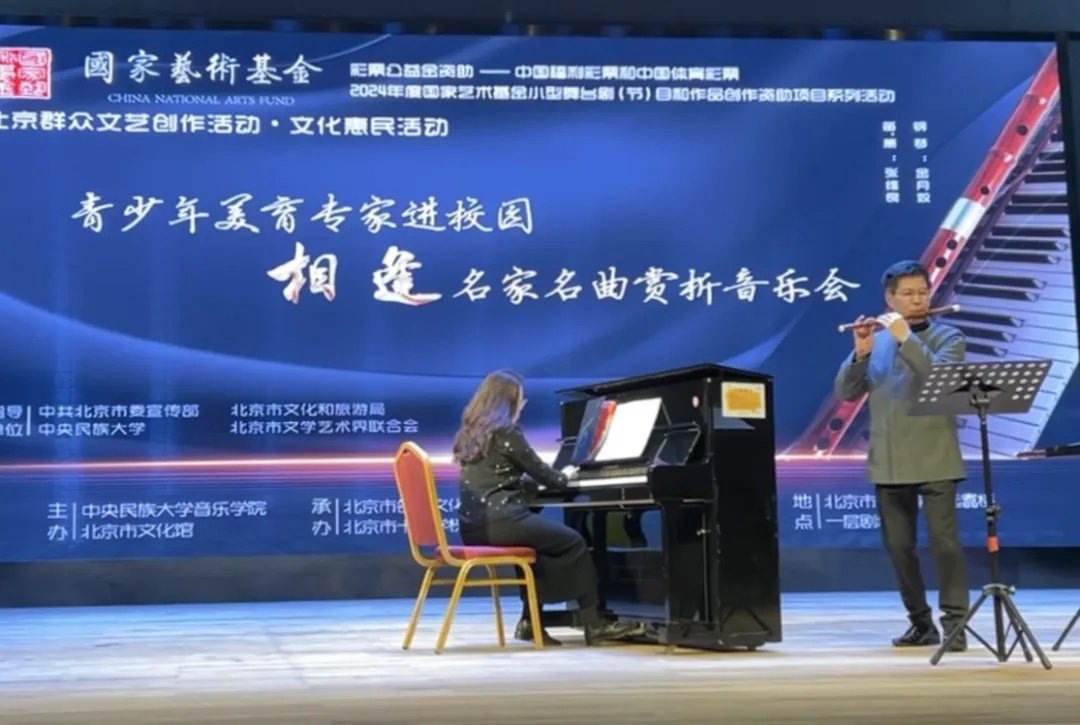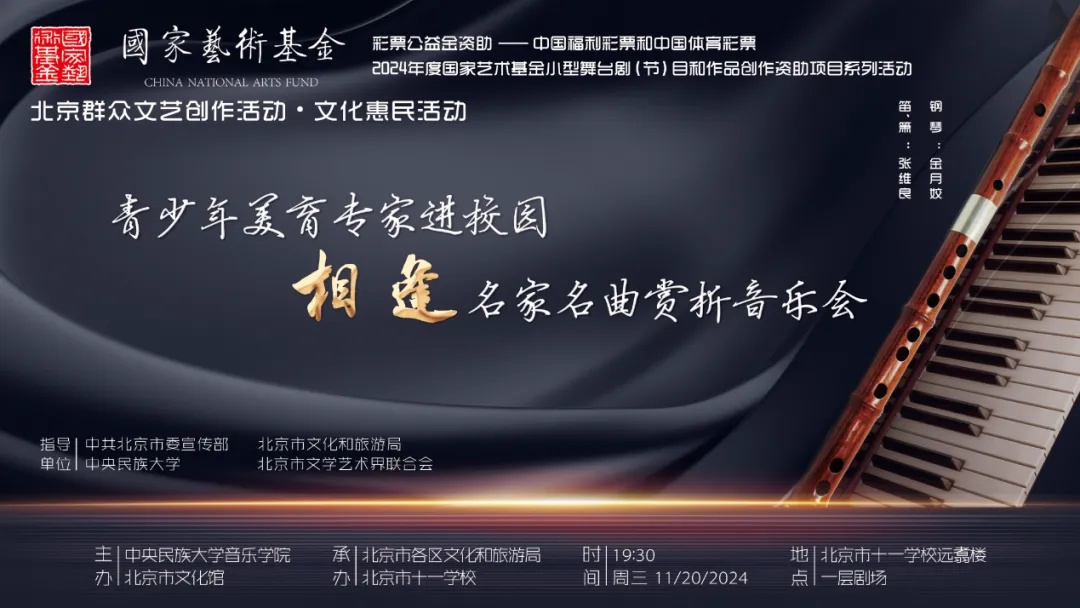 为完善公共文化服务体系,建立优质文化资源直达基层机制,健全社会力量参与公共文化服务机制,由北京市文化馆、中央民族大学音乐学院联合主办,北京市十一学校承办的北京群众文艺创作活动-青少年美育专家进校园—“相逢”名家名曲赏析音乐会于2024年11月20日在北京市十一学校圆满完成。