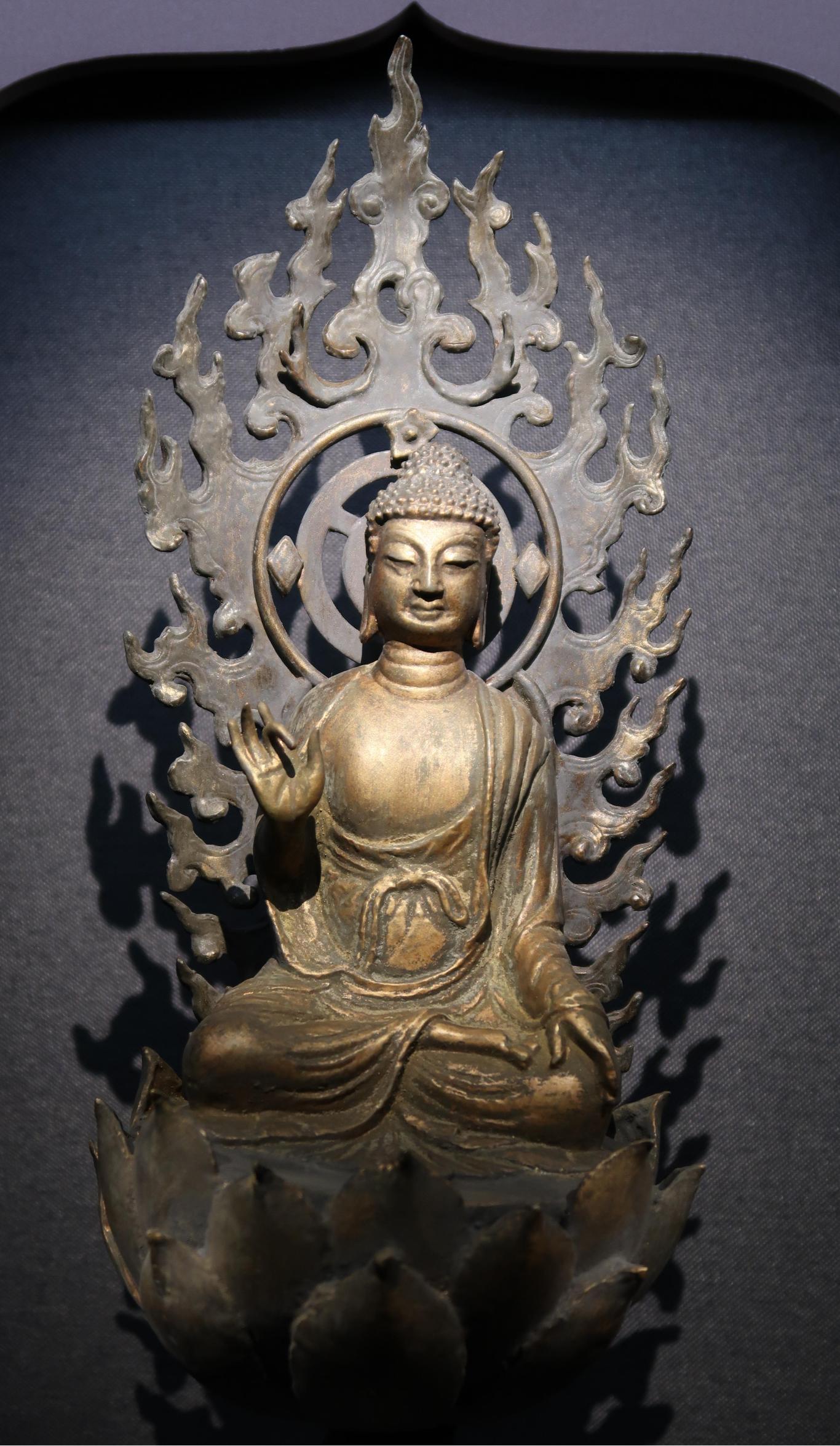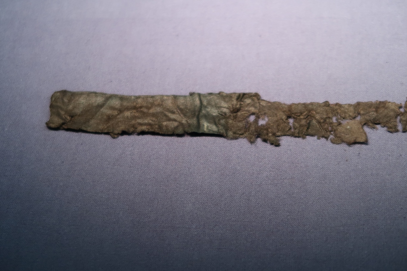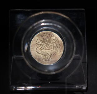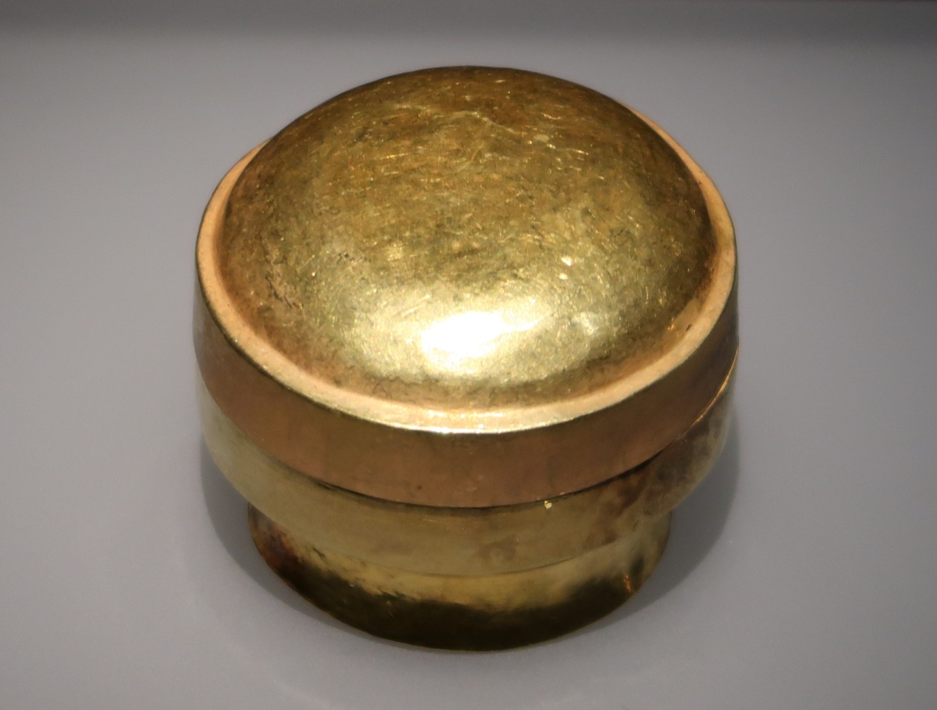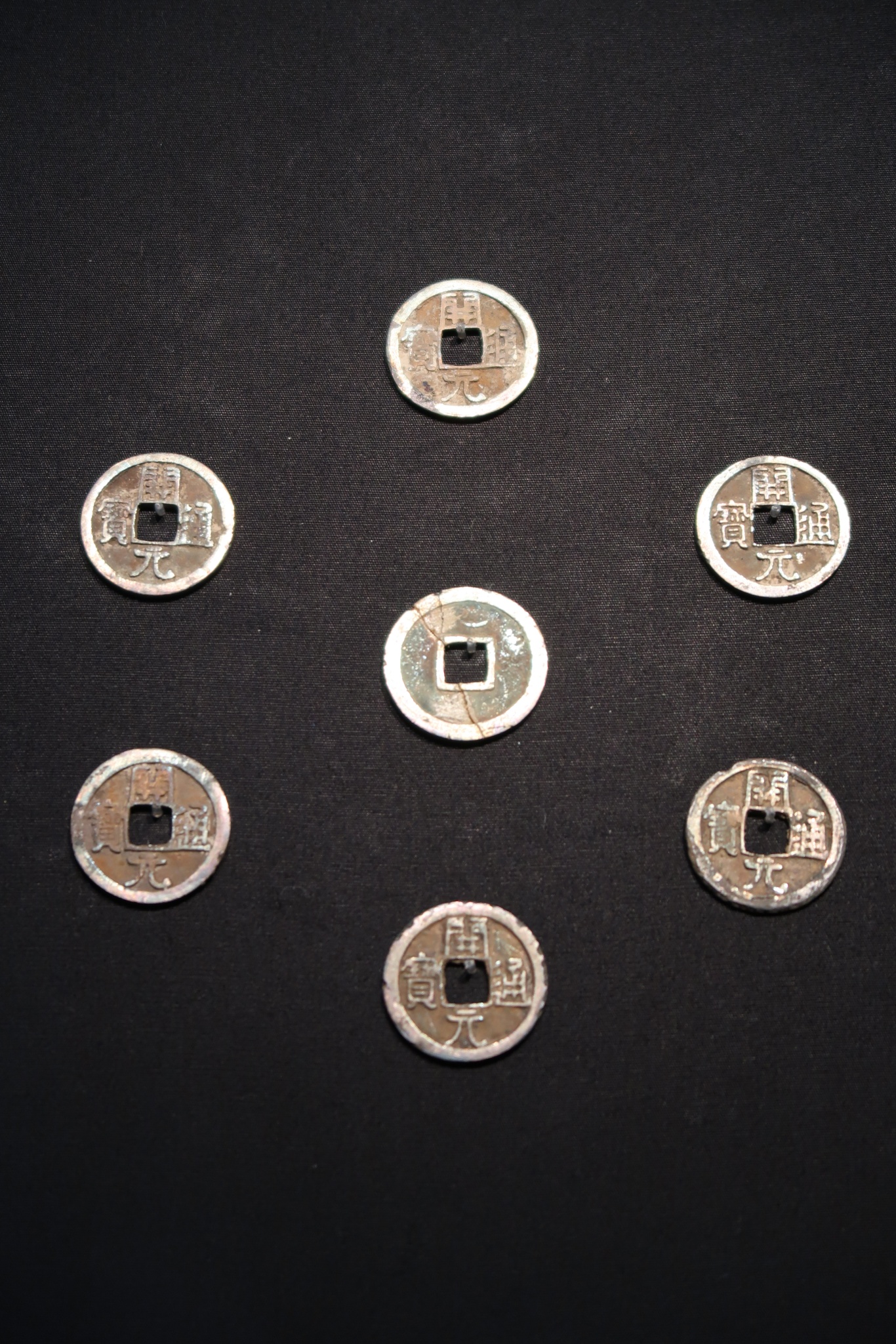 水丘氏墓出土,一组7枚。一枚背面有上月纹,其余皆为素面。“开元通宝”是唐代铸造的一种货币,有金、银、铜、铁、铅多种材质。官铸用于流通的主要是铜质,而金质、银质开元通宝不作为流通货币使用,多用于吉庆、赏赐、游戏、新婚夫妇撒帐、婴儿过满月等,因此存世量极小。这7枚开元通宝钱币为银质鎏金,应为中原皇室赏赐,是古钱币中罕见的珍品。