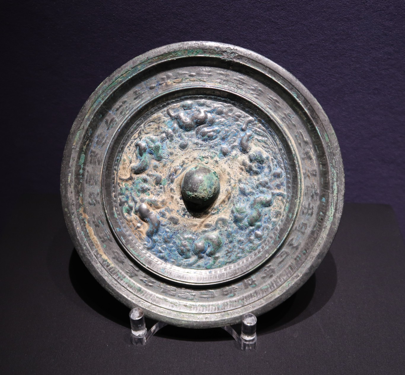 铜镜主体纹样为六瑞兽绕钮呈奔跑状,外圈铭文为32字楷书四言骈体文。此类铭文在隋唐的团花镜中常见。辽会同五年(942)耶律羽之墓中,也发现有相同纹样及铭文的铜镜。