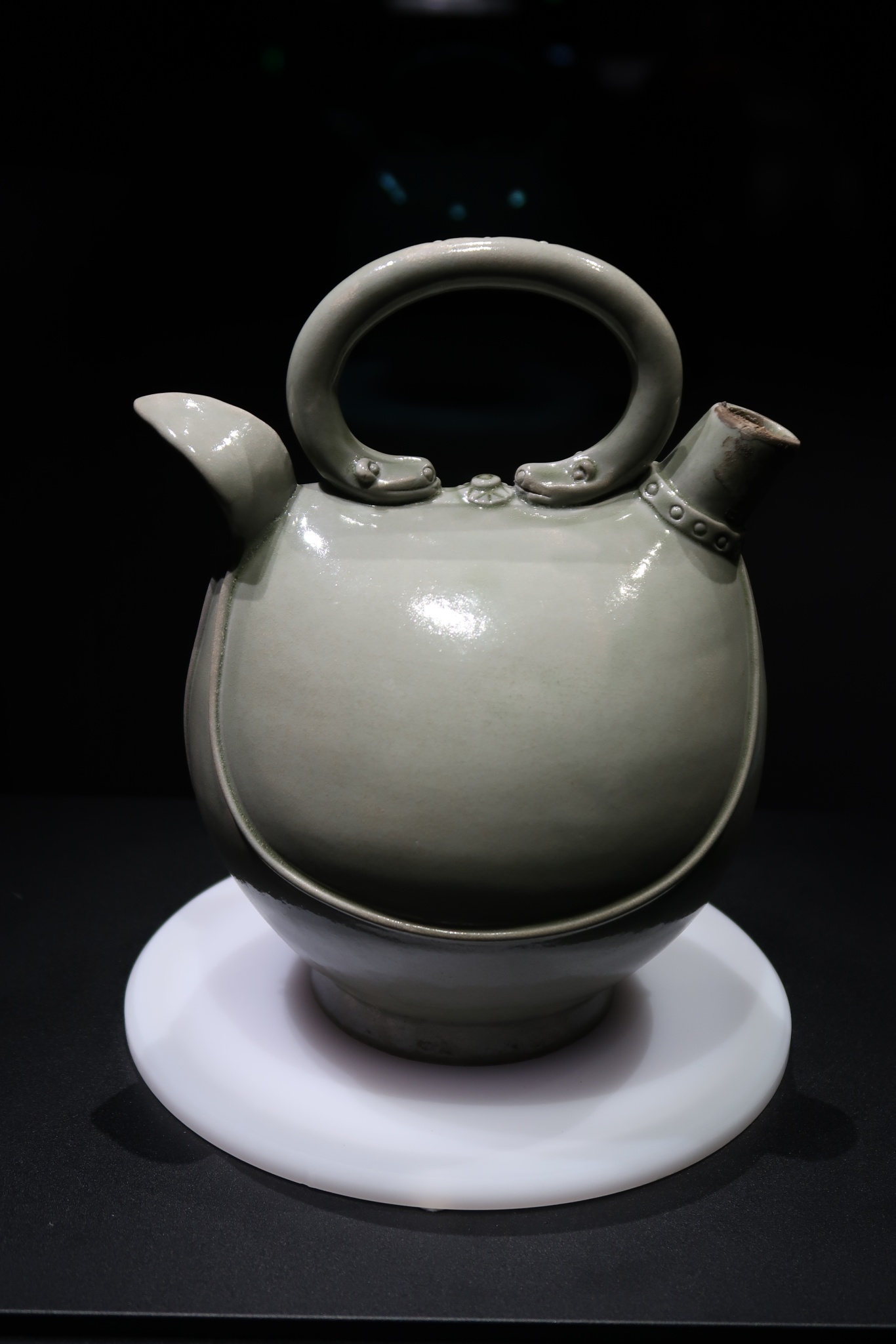 有时,吴越国秘色瓷也会受到他国文化的影响,呈现出独特的形制。例如秘色瓷皮囊壶就是对辽国文物的仿制,皮囊壶是辽国人的生活用品,又是能代表身份地位的贵族用品。秘色瓷皮囊壶的出现,说明了吴越国的文化包容和在制瓷技术上的不断创新。