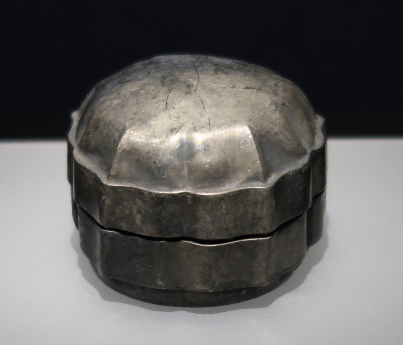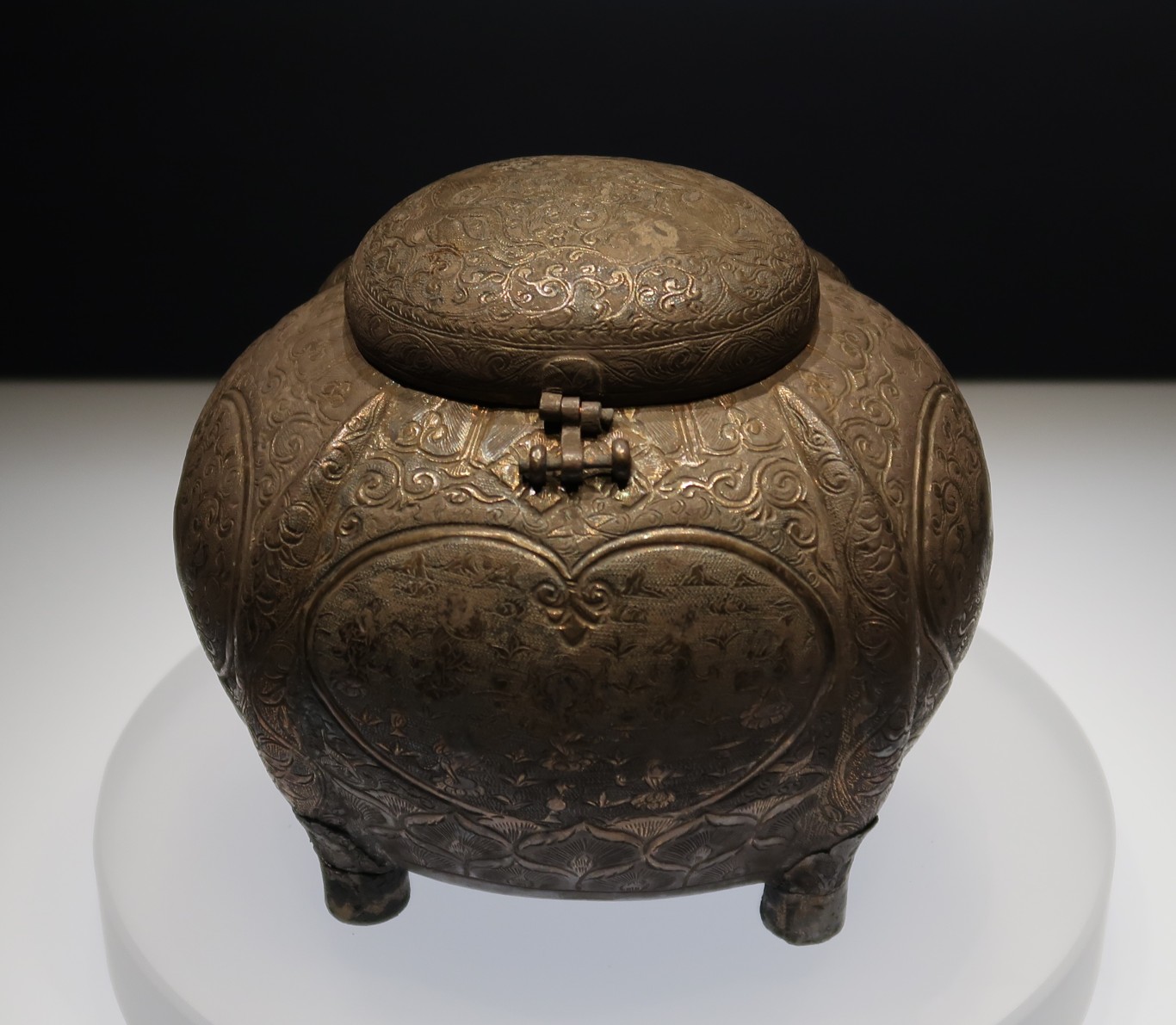 水丘氏墓出土银器中最为完整的一件。盖与罐之间铆焊铰链、搭襻相连。整器平面略方,四角弧转。罐身四条自上而下的凸棱,花纹部分鎏金,是典型的“金花银器”。器盖錾刻双凤衔枝纹,器身四面中间开光分别錾刻龙、狮、伎乐等纹饰,造型端庄优美,工艺精致细腻,纹饰繁而不乱,充分体现了晚唐高超的金银器制作水平。