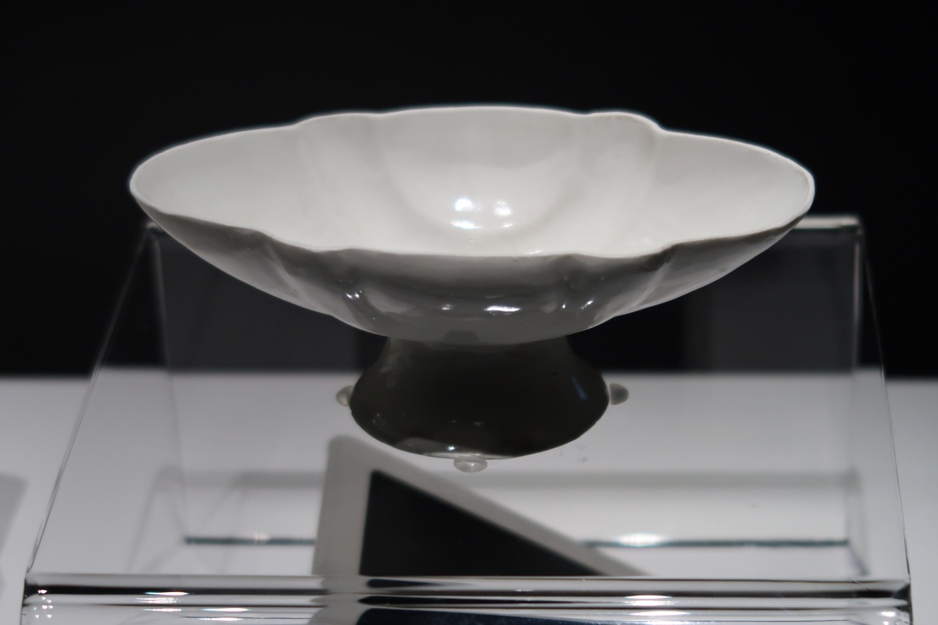 当然,吴越国也并不只是能看到青瓷。如果说“类冰似玉”的吴越秘色瓷为世人青睐,那么“类银似雪”的白瓷亦毫不逊色,吴越国因屡立战功又恪尽职守为中原朝廷上贡青瓷,来自北方的精品白瓷也被大量赐给吴越国王,所以在吴越国也可看到白瓷。这些白瓷多刻“官”款、釦金银,符合“金装定器”的描述,与定窑遗址出土的如出一辙。