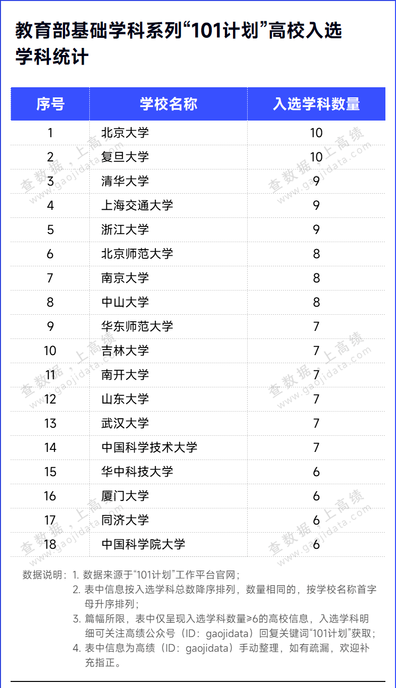 北京大学和复旦大学在11个学科中有10个学科入选“101计划”,数量最多。清华大学、上海交通大学和浙江大学有9个学科入选“101计划”,与另外两所高校组成全国五强。18所高校入选学科数≥6个。