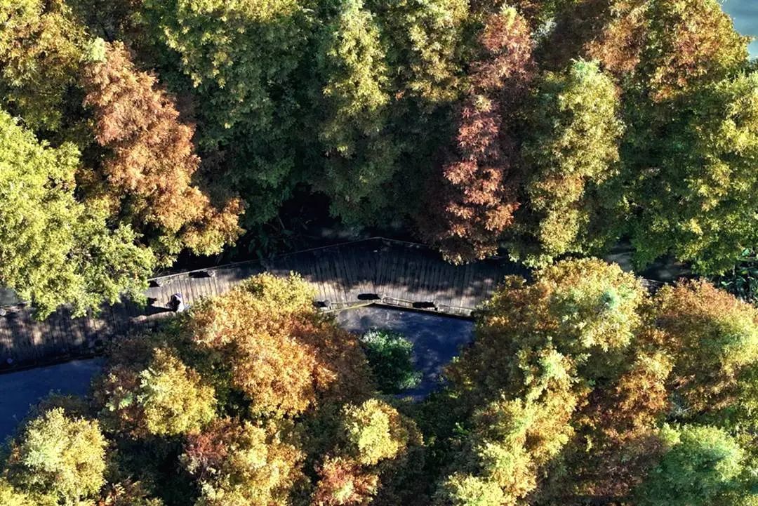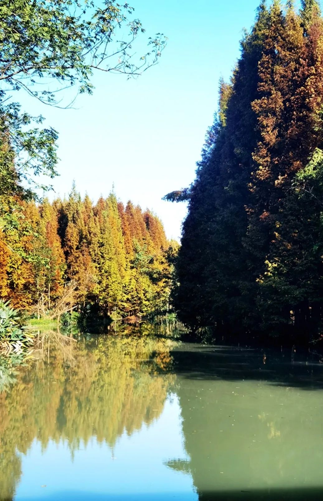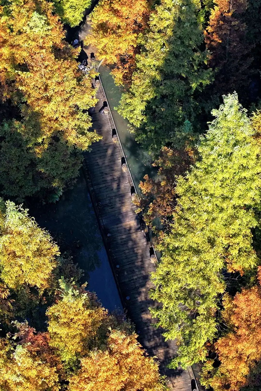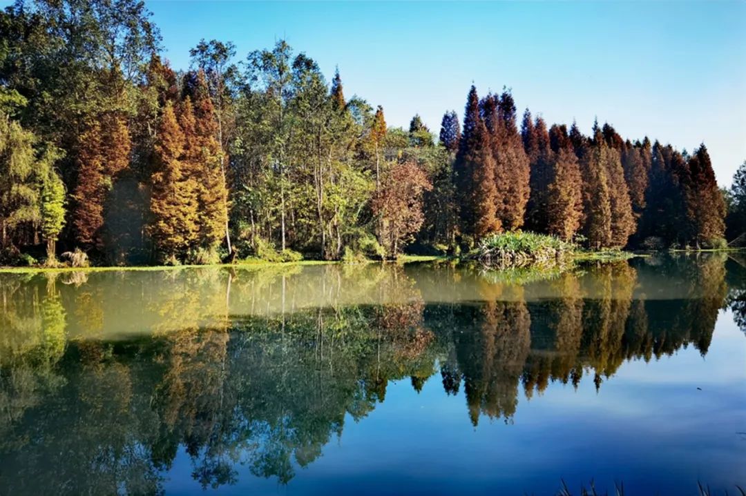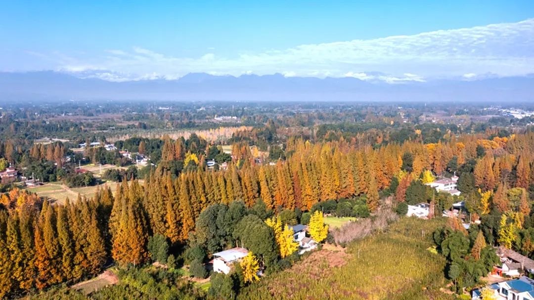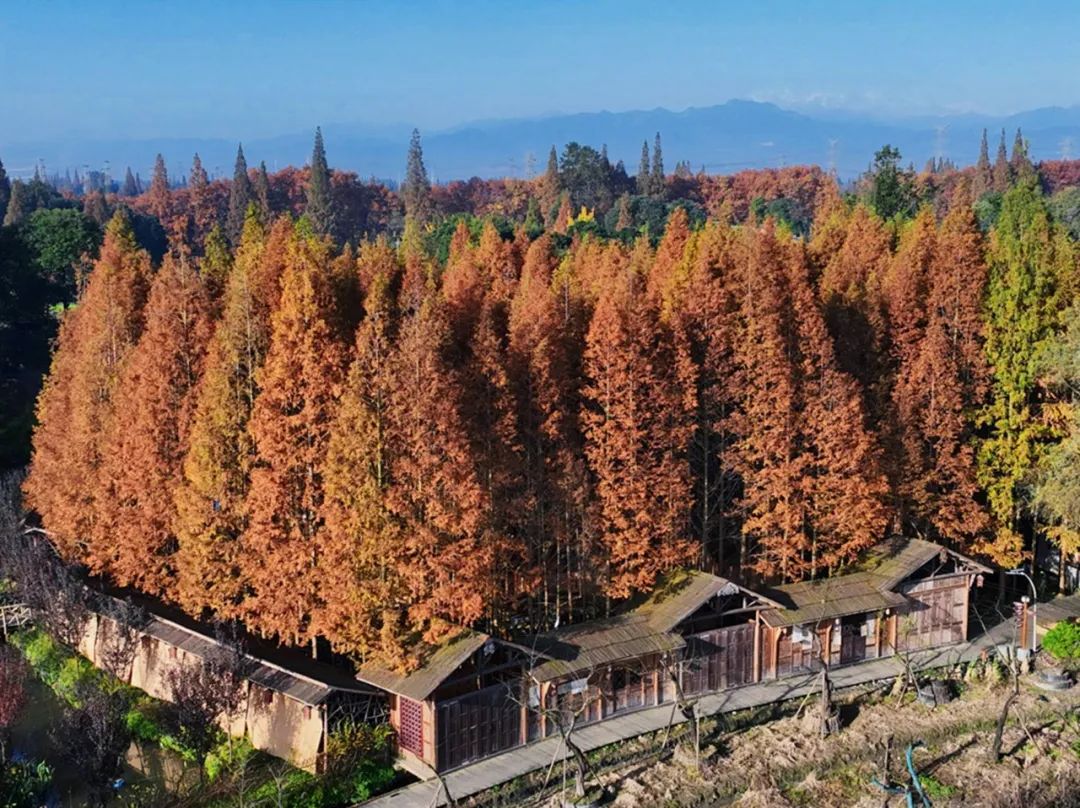 廖家镇木玩村AAA级林盘景区,20余亩水杉逐渐上色,仿佛落入童话世界。旁边是龙马艺雕博物馆,可欣赏省级非遗——廖家木雕。