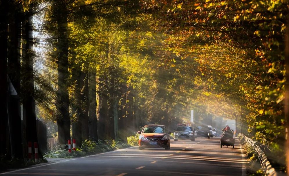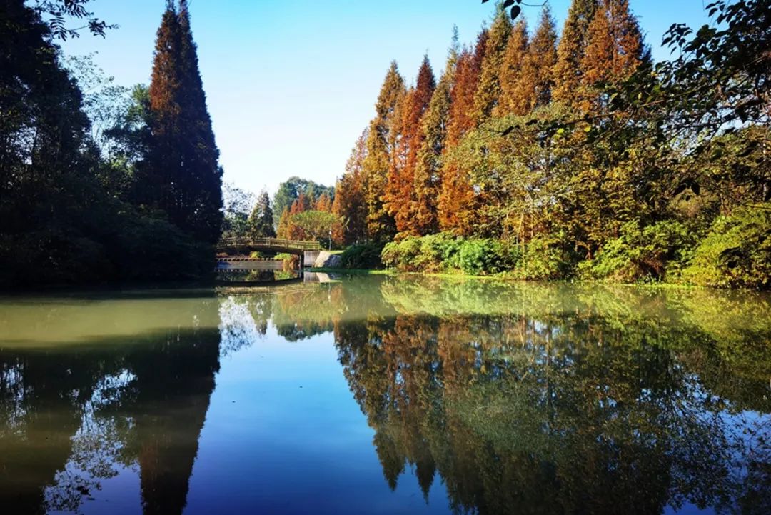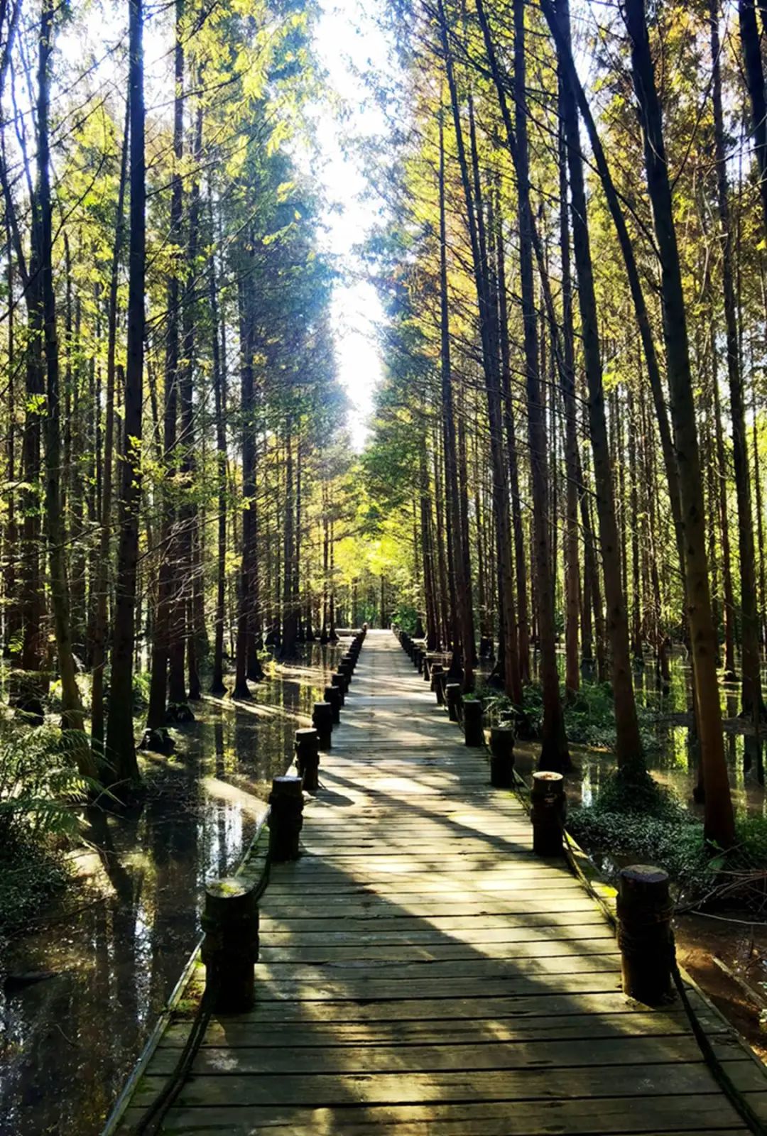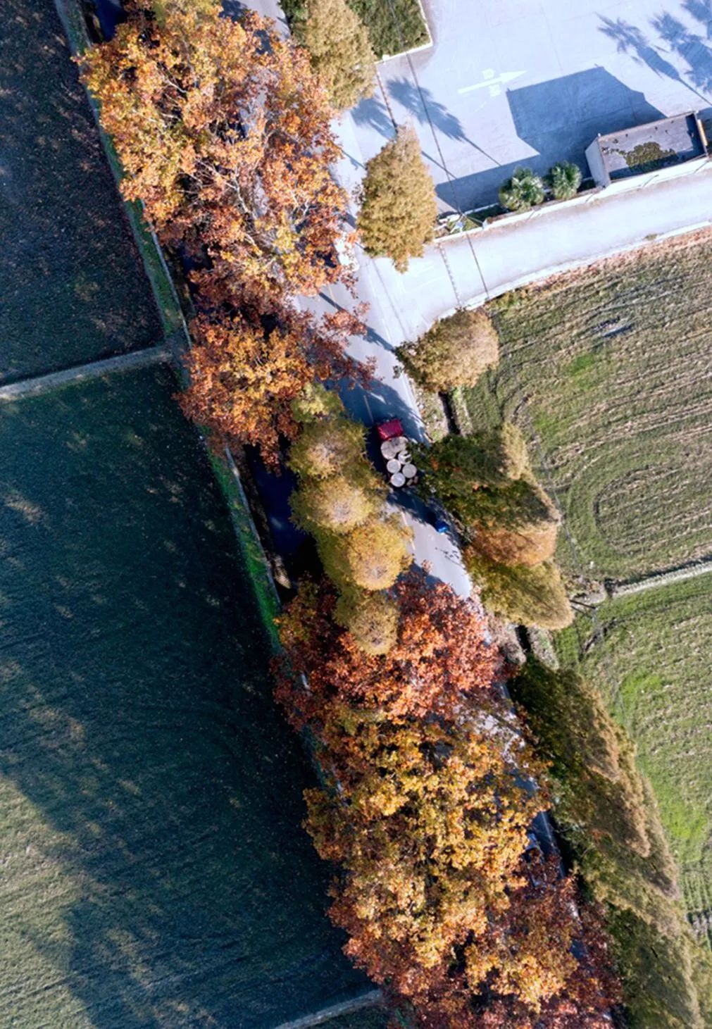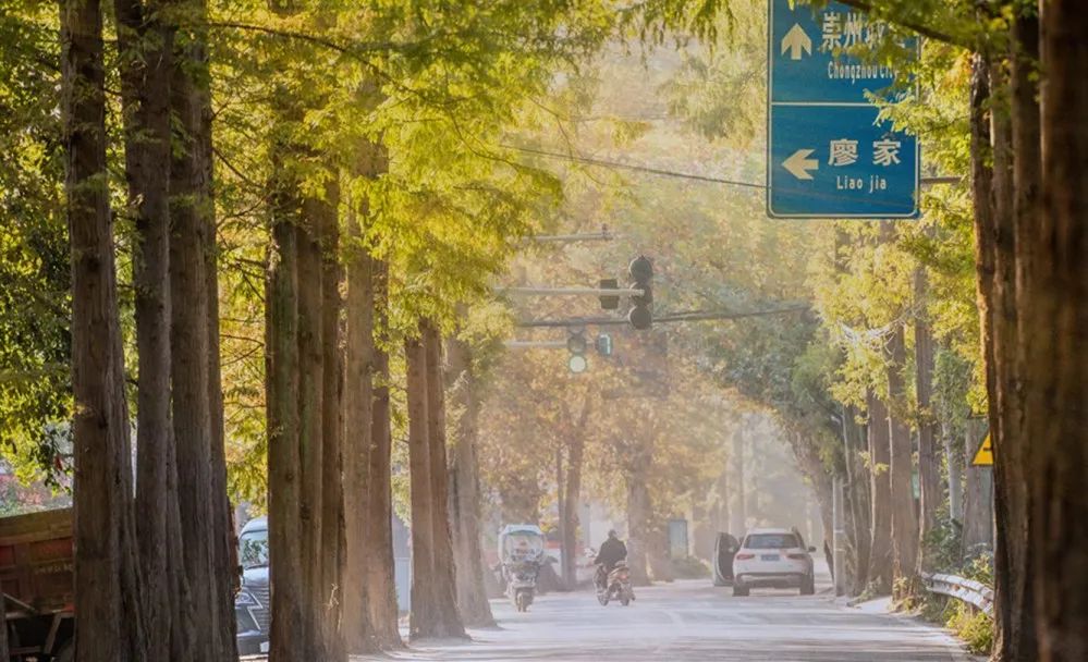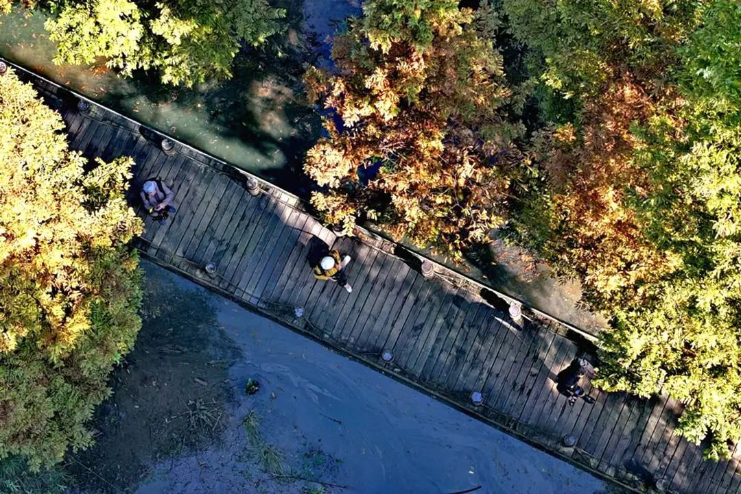 廖家镇木玩村AAA级林盘景区,20余亩水杉逐渐上色,仿佛落入童话世界。旁边是龙马艺雕博物馆,可欣赏省级非遗——廖家木雕。