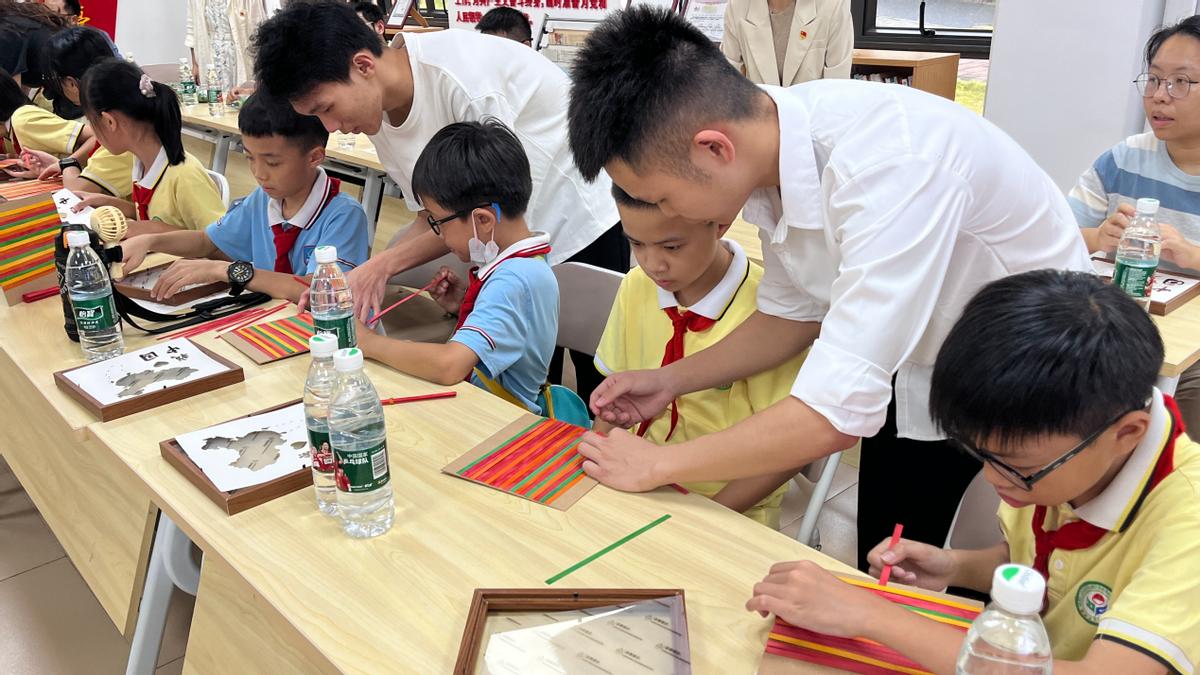 在“大手拉小手,非遗竹编手工体验”环节,大学生与小学生一对一结对,共同参与了非遗竹编的制作。在学生党员的耐心指导下,小学生们认真学习竹编技艺,共同完成了以爱国教育为主题的竹编作品。体验环节不仅展示了同学们巧手和智慧,一穿一压中更传递了广东建设职业学院作为现代鲁班摇篮的校园文化,让参与者身体力行劳动精神、劳模精神、工匠精神。