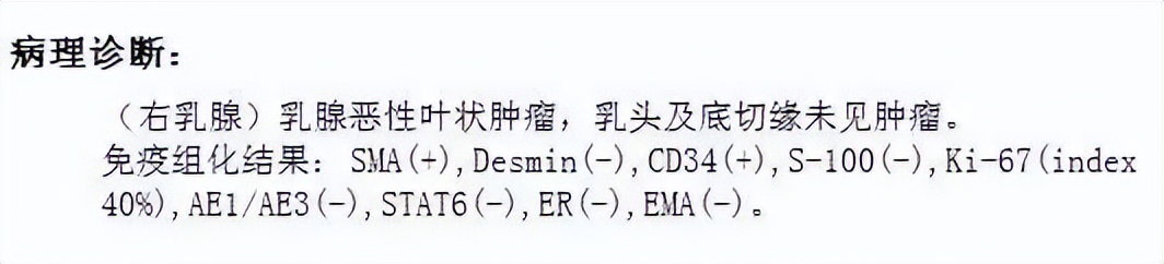 这是一例恶性叶状肿瘤。乳腺的肿瘤分为上皮源性肿瘤(最常见为增生、瘤或者癌等)、纤维上皮性肿瘤、间叶源性肿瘤和淋巴造血系统肿瘤。其中纤维上皮性肿瘤是除了上皮源性肿瘤外最常见的肿瘤类型,包括良性叶状肿瘤、交界性叶状肿瘤和恶性叶状肿瘤3种。交界性叶状肿瘤复发风险较高,而恶性叶状肿瘤可发生远处转移、危及生命。