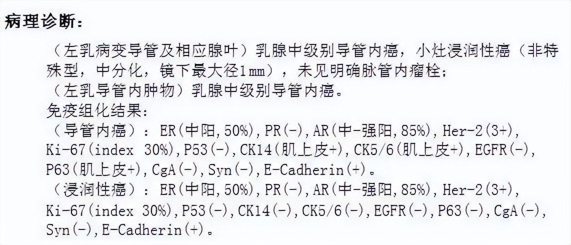 这是一个以原位癌为主,伴有小灶浸润性癌的病例。当乳腺肿物以原位癌为主,没有明确的浸润性癌时,病理科医生需要把原位癌全部取材,仔细寻找浸润性癌存在的可能性。≤1 mm的浸润性癌,叫微小浸润性癌。如果足够幸运,浸润性癌在免疫组化中也还没有被切完,则会分别报告原位癌和浸润癌的激素表达情况、HER2及Ki-67表达情况,以供临床医师制定精准的治疗方案。但1 mm非常小,往往在免疫组化检测中已经被切完了,这时候报告中会注明“组织太小,免疫组化无法评估”。