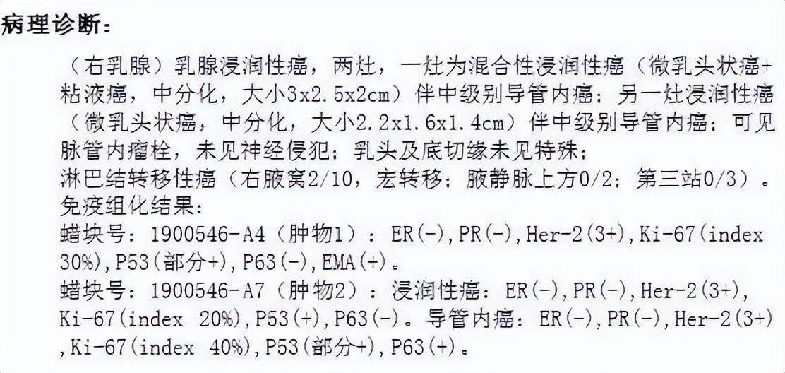 这个患者有两灶浸润性癌,一种是浸润性微乳头状癌与粘液癌混合性癌,一种是纯的浸润性微乳头状癌,两个癌灶大小分别报告。