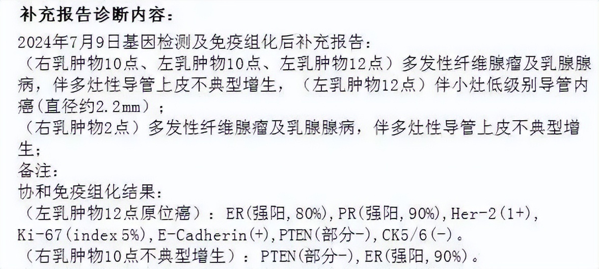不典型增生是乳腺的癌前病变,如果查到有不典型增生,需要定期随访。这是一例特殊的不典型增生,需要进一步检查PTEN的基因突变情况。如果发现这种补充报告的情况,多是在送检的时候,没有想到有恶性或者癌前病变,没有预收费,这时病理科医生便会给您发放建议做免疫组化的报告,同时开免疫组化医嘱。在缴费后,免疫组化会自动执行,您可在家中安心等手机通知结果即可,不必辛苦折返医院问询。