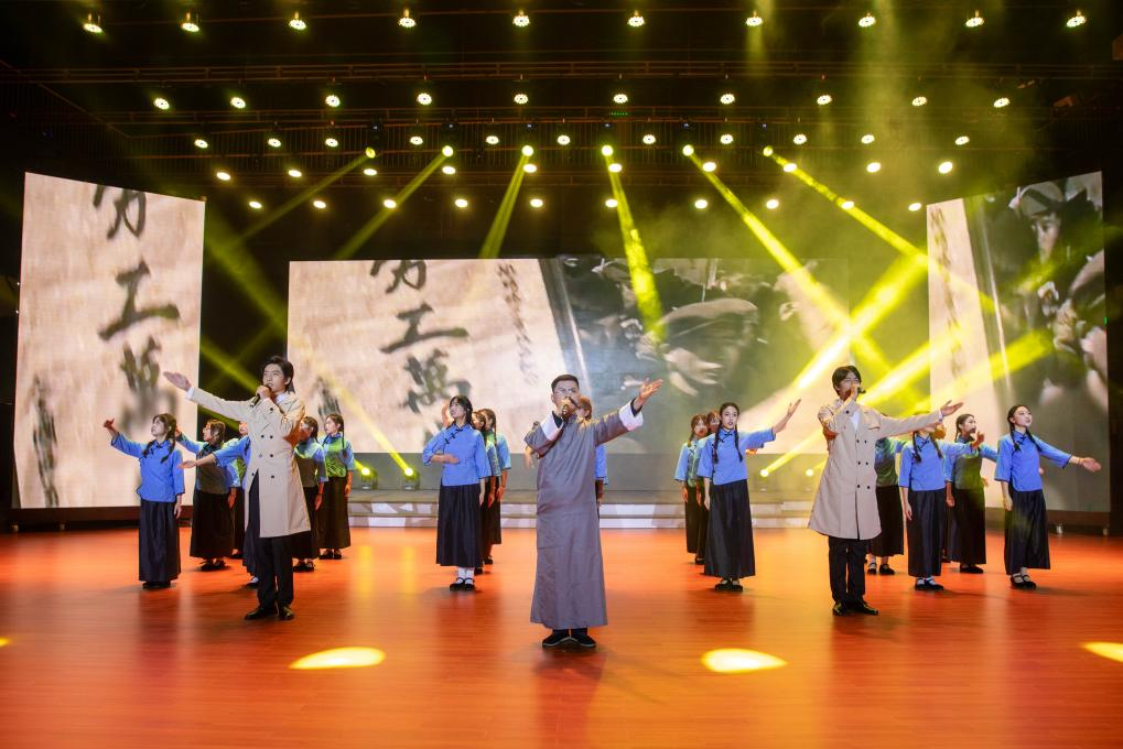 “少年雄于地球,则国雄于地球!”思政课尾声,饰演李大钊、陈延年、陈乔年的师生演员登台,带领全场观众一同挥动手中的国旗,齐声诵读《少年中国说》。巨幅显示屏上播放着一幅幅青年们为国家独立和民族振兴而英勇奋斗的壮丽图景,慷慨激昂的朗诵声响彻大会堂,鲜红旗帜与绚丽灯光交相辉映,融汇成一片沸腾的红色海洋,将课堂氛围推向高潮。