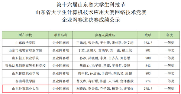 近日,第十六届山东省大学生科技节暨山东省大学生计算机技术应用大赛网络技术竞赛决赛顺利举行。经过激烈的角逐,山东外事职业大学参赛团队在企业网赛道的众多参赛队伍中脱颖而出,荣获团队一等奖。