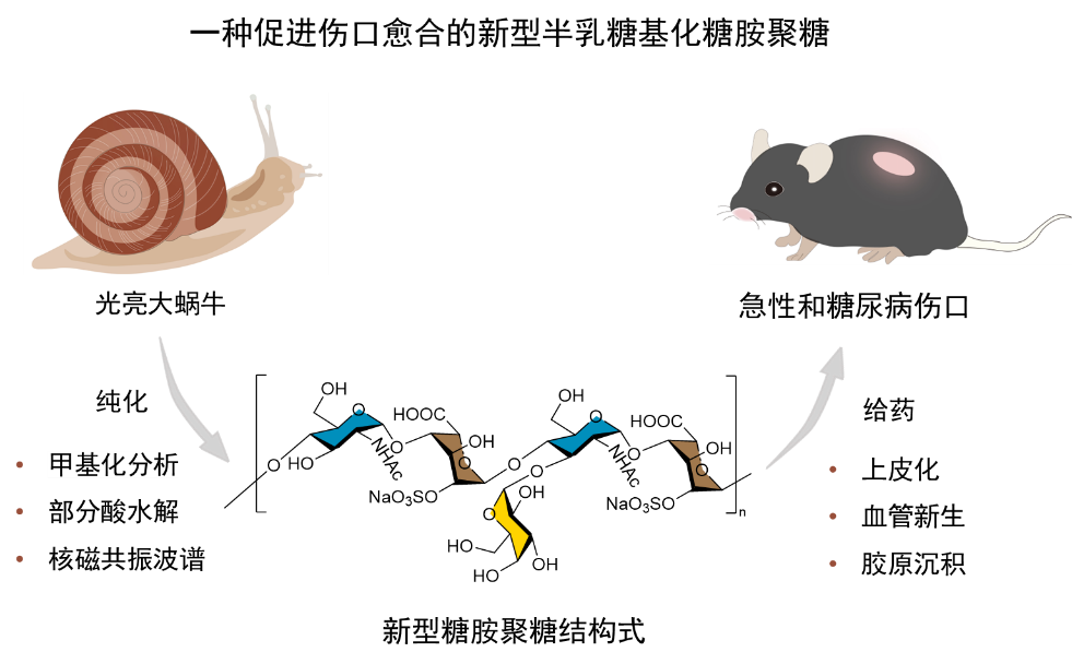科研人员将其发现的新型糖胺聚糖应用于小鼠急性和糖尿病伤口模型,结果发现其可有效促进炎症改善、肉芽组织增生、血管新生和胶原沉积,从而加速伤口愈合。对比光亮大蜗牛和白玉蜗牛来源的糖胺聚糖,两者具有相似的主链结构,不同之处在于前者具有半乳糖侧链而后者不带侧链,对促伤口愈合活性进行对比发现,前者的效果优于后者,因此推测,糖胺聚糖独特的侧链结构对活性可能具有增强作用。