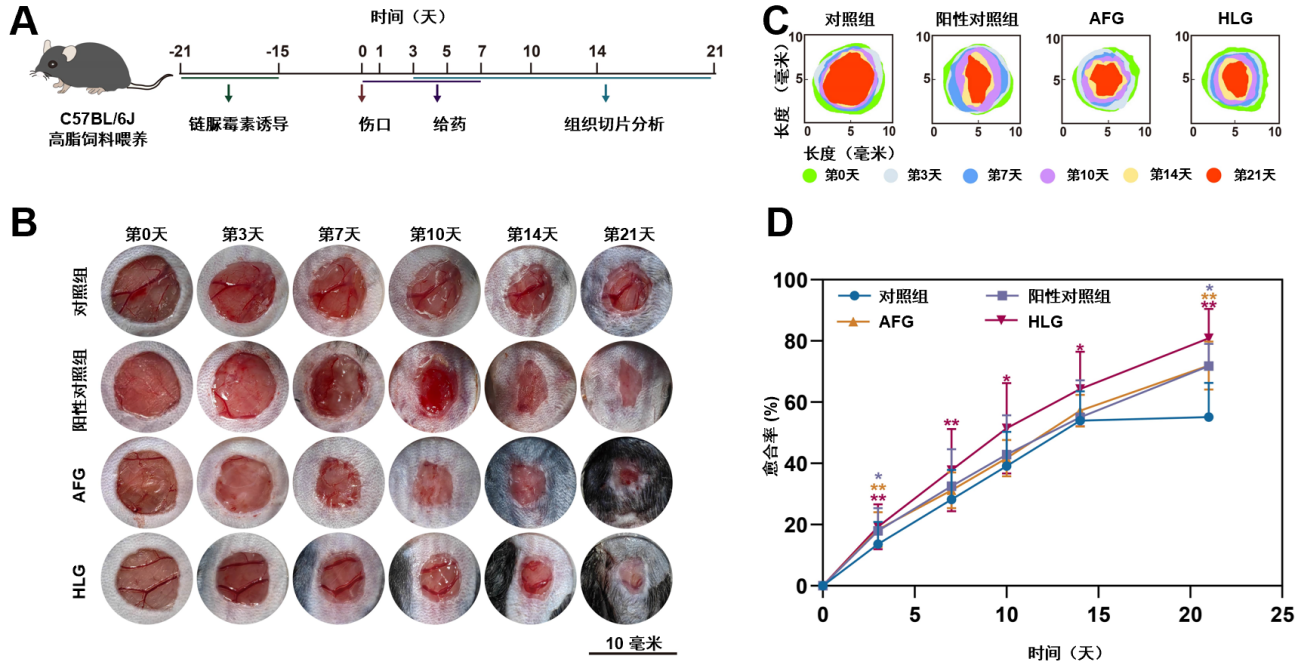图5 糖尿病伤口模型及蜗牛糖胺聚糖的促伤口愈合作用(图片来源:改编自参考文献1)