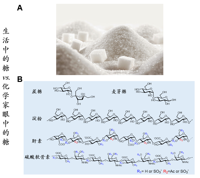图3 生活中的糖(A)和化学家眼中的糖(B)(图片来源:A来自Veer图库,B由作者提供)