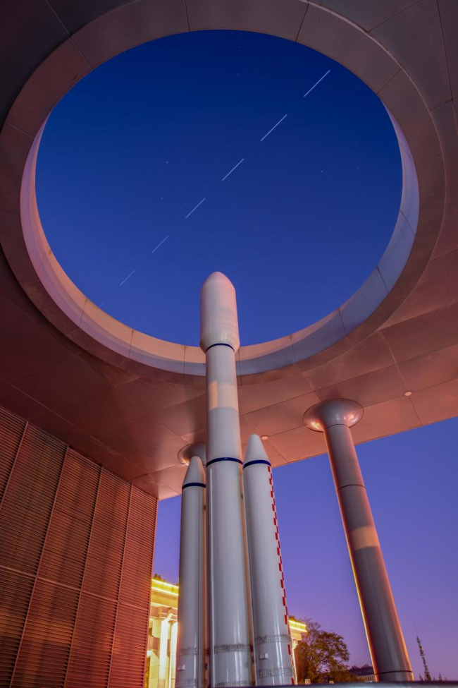 下图为火箭万源地铁站长征8号火箭模型与“天宫”空间站(图中白色虚线)在延时摄影状态下的同框照片。