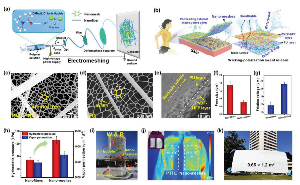 a.电纺织技术示意图;b. 纳米网织物的防水性、透气性和排汗性示意图;c-e. 纤维材料的电镜图;纳米纤维与纳米网织物的孔径对比图(f)、摩擦电压对比图(g)、防水性和透气性对比图(h);i. 展示纳米织物的防水和透气能力;j. 纳米织物的热湿舒适性;k. 大尺寸纳米织物图片(图片来源:参考文献1)