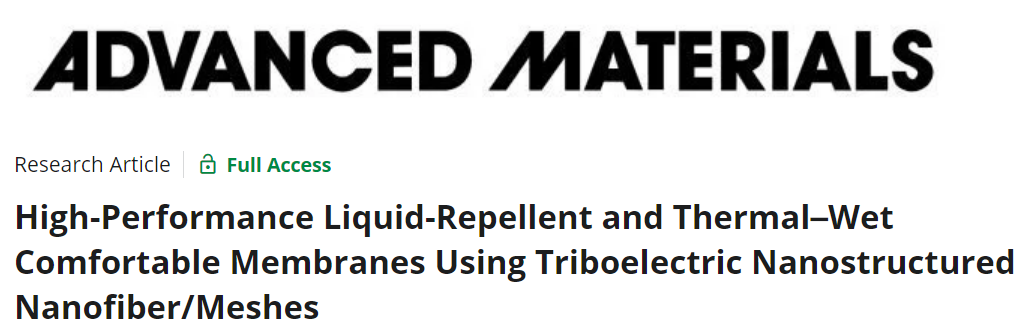 [1]Gong X , Ding M , Gao P ,et al. High-Performance Liquid-Repellent and Thermal–Wet Comfortable Membranes Using Triboelectric Nanostructured Nanofiber/Meshes[J]. Advanced Materials, 2023.