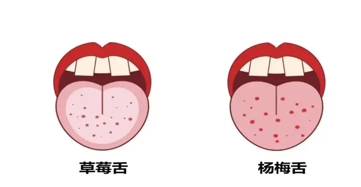大多数患者在发病1~2天出现皮疹,从耳后、颈部、上胸开始,这些皮疹呈鲜红色,如针孔大小,可遍布全身,摸起来手感像砂纸。初期舌头白色舌苔,表面有小红点,像草莓舌,同时,患者面部常充血潮红,但口周和鼻子周围可能呈现苍白圈。2~3天后舌面光滑肉红色,仍有小红点,像杨梅舌。发病一周后皮肤脱屑,可能持续几周左右才能完全消退。