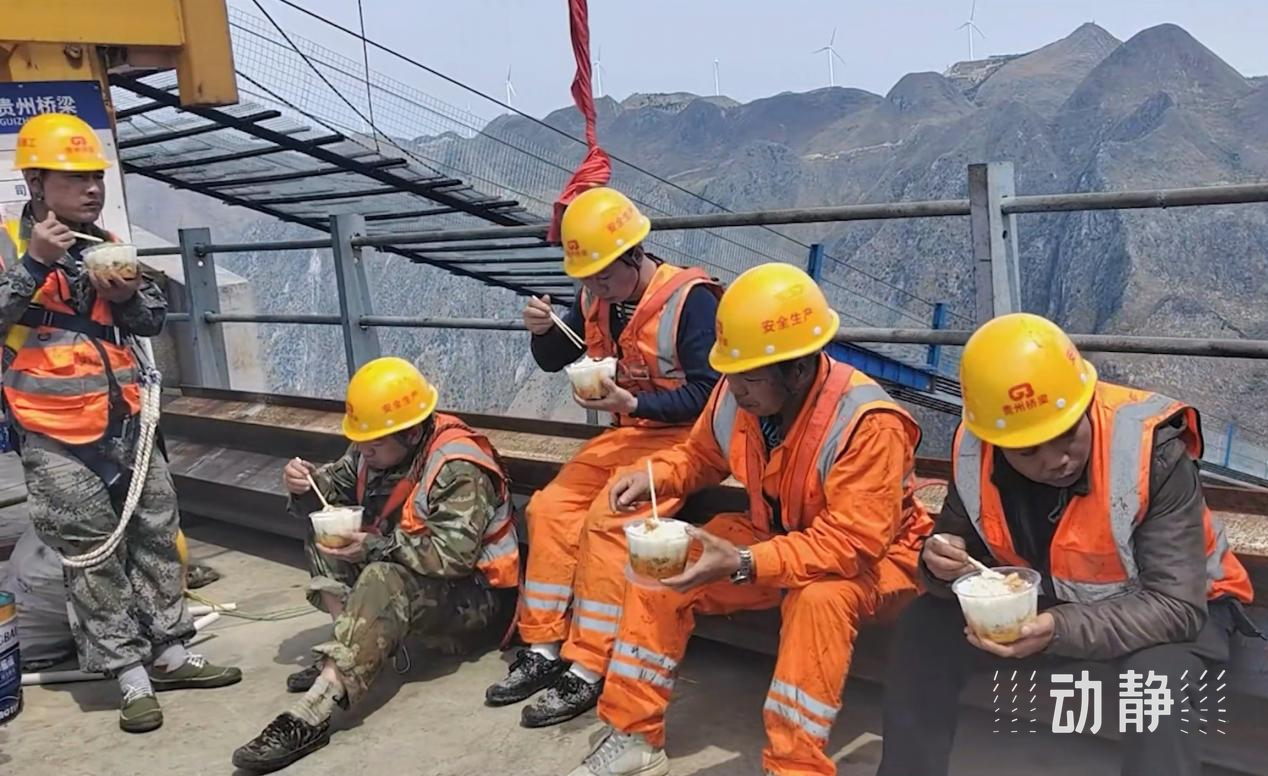 为节约上下主塔的“黄金一小时”,工人在白天均坚持就地用餐,每天由专人送饭到主塔、猫道及对岸的施工点,大家争分夺秒,有效抢时间、提升工作效率。