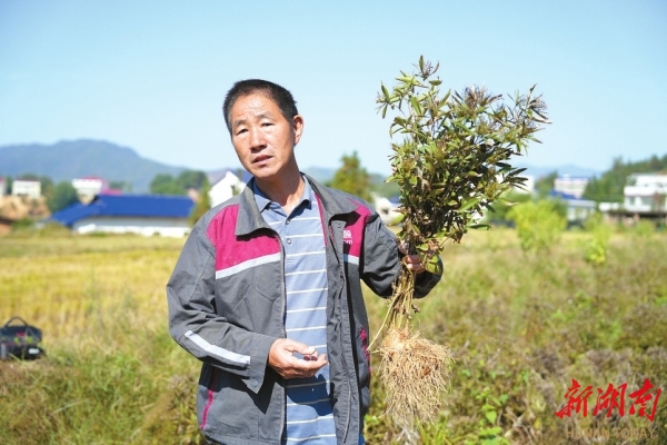 (平江县童市镇排形村村民吴仕涛在展示自己种植的白术。)