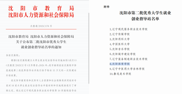 近日,沈阳市教育局、沈阳市人力资源和社会保障局公布了第二批沈阳市优秀大学生就业创业指导站名单,沈阳体育学院获批“沈阳市优秀大学生就业创业指导站”。