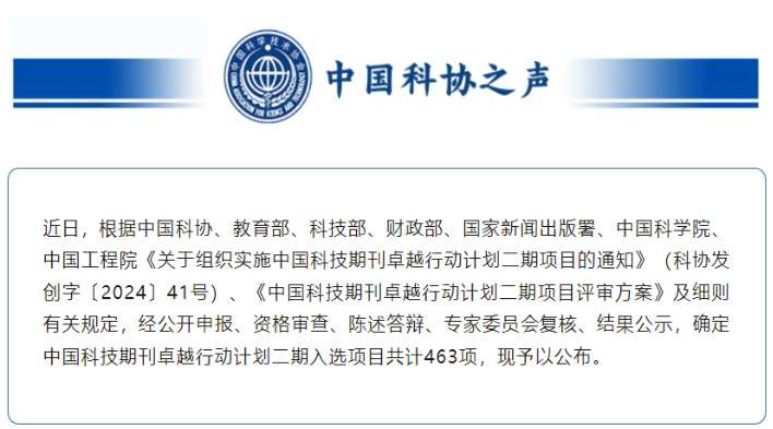 鉴于一期项目(2019—2023年)成果显著,二期项目(2024—2028年)拟从我国6000余本期刊中择优遴选450本,继续进行资助和支持。其中,英文领军期刊50本,梯队期刊150本;中文领军期刊100本,梯队期刊100本(含科普期刊10本);高起点新刊50本。经公开申报、资格审查、陈述答辩、专家委员会复核、结果公示,最终确定入选期刊名单。