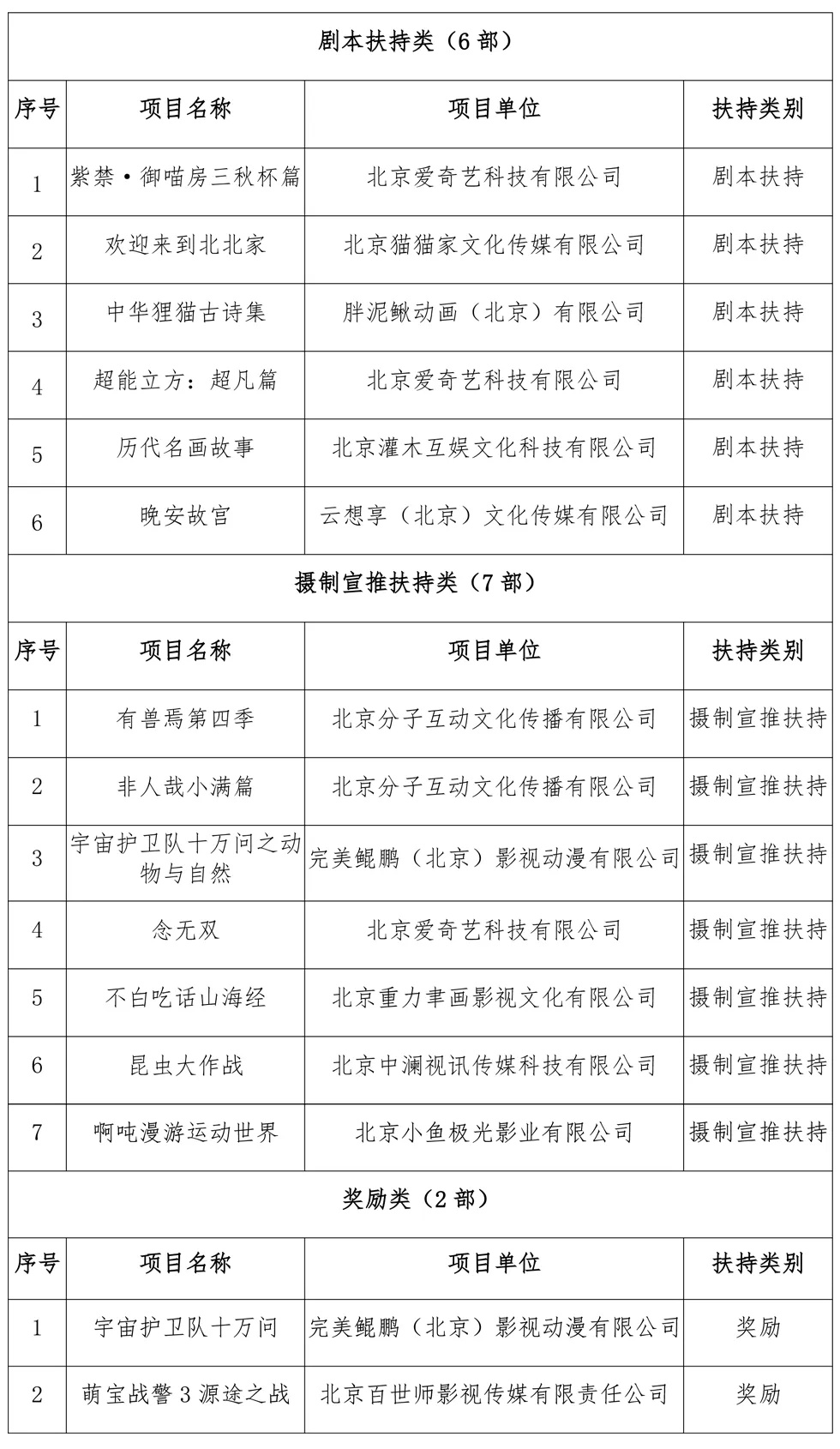 三、动画片拟扶持及奖励作品名单