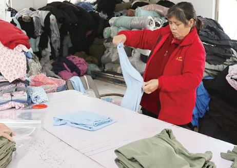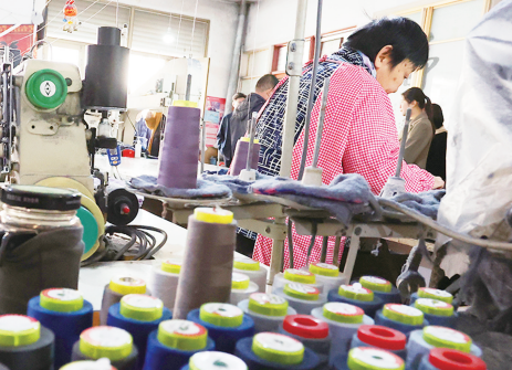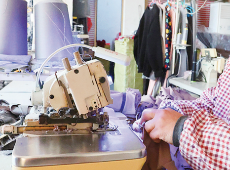 在一间普通的民房加工车间里,53岁的姚淑民正熟练地操作着缝纫机,随着缝纫机针头的上下跳动,一条秋裤的收腰逐渐成形。