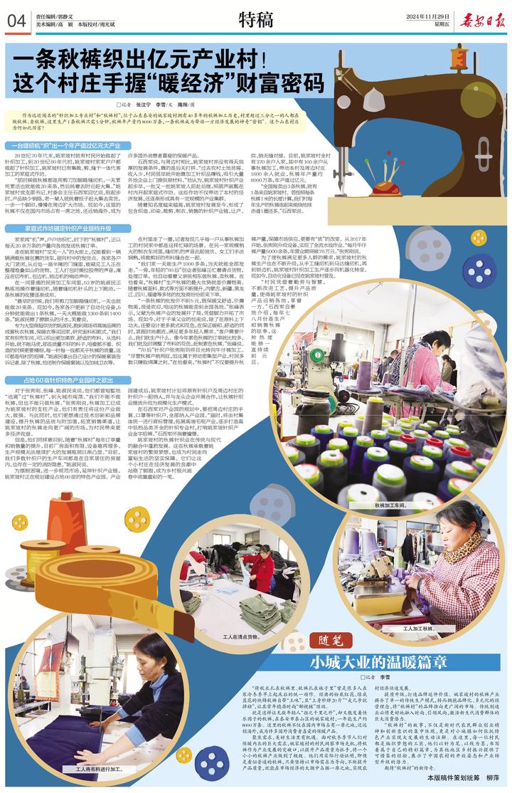“一条秋裤的批发价不到5元,既保暖又舒适,价廉物美,很受欢迎,咱这的秋裤能卖到全国各地。”张峰表示,父辈为秋裤产业的发展开了局,凭借脚力开拓了市场。现如今,对于子承父业的他来说,除了在原料上下功夫,还要设计更多款式和花色,在保证暖和、舒适的同时,紧跟时尚潮流,满足更多年轻人需求。“客户需要什么,我们就生产什么。像今年素色秋裤的订单就比较多,我们就及时调整了布料的花色,赶制素色秋裤。”张峰说。