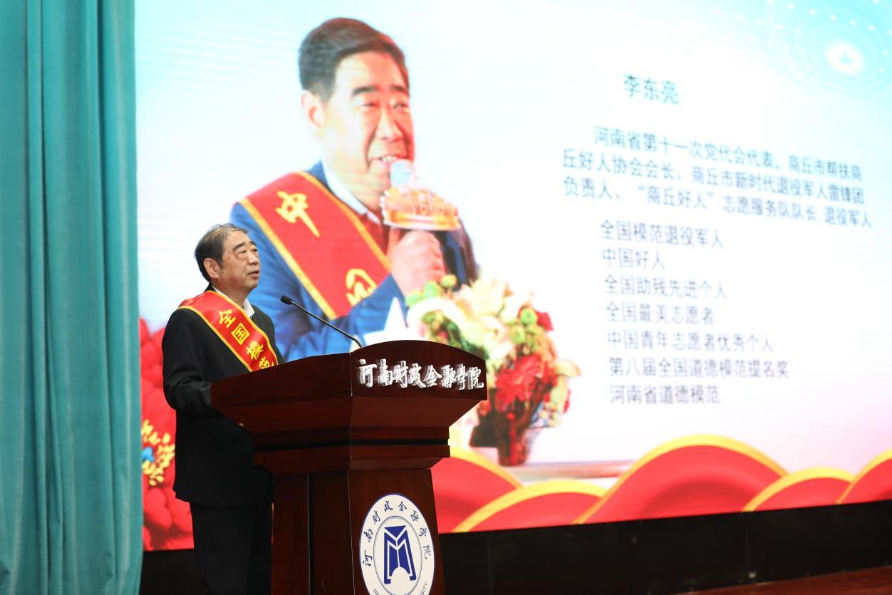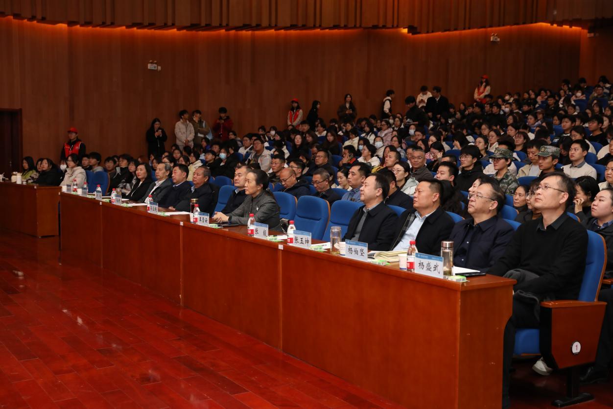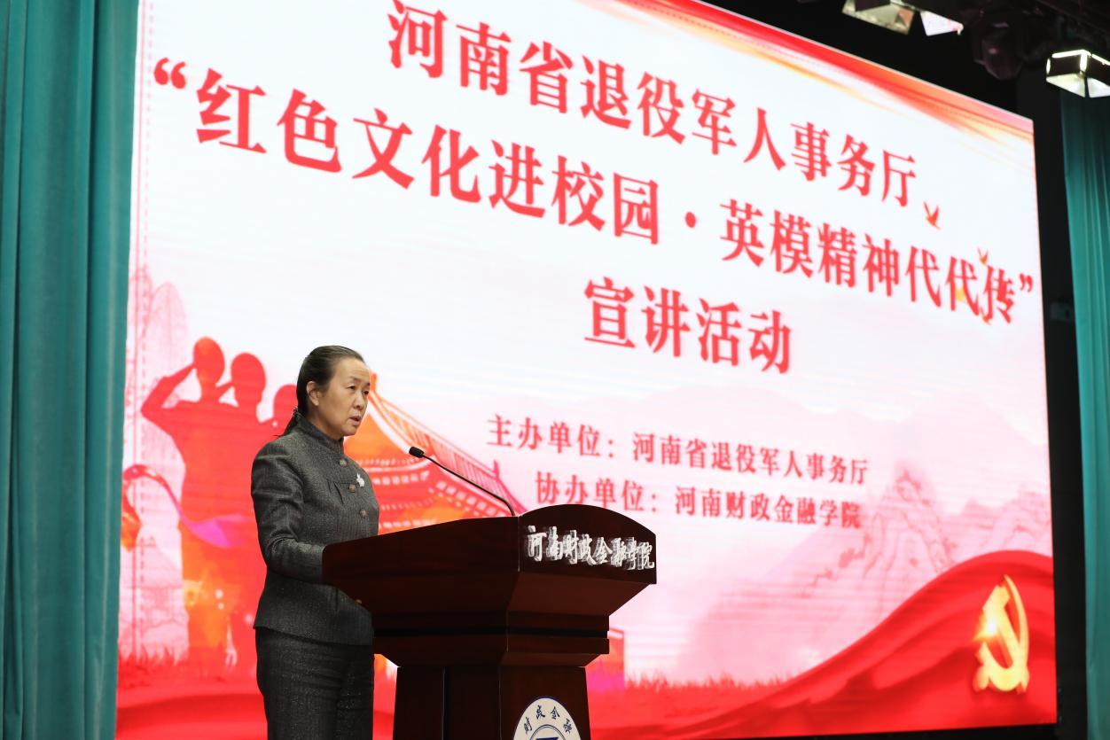 王雪云在致辞中对出席活动的各位领导、宣讲团同志们表示欢迎,她简要介绍了学校的基本情况、办学特色和发展成果。她指出,近年来学校围绕建设特色鲜明、办学优势突出的财经类应用型本科高校的目标,以培育践行社会主义核心价值观为引领,着力传承以焦裕禄精神、红旗渠精神、大别山精神为主要内容的红色文化,积极培育以“忠诚、诚实、守信”为核心的诚信文化,努力用红色文化擦亮学生政治底色,用诚信文化塑造学生道德品格。希望以本次宣讲活动为契机,进一步深入实施立德树人工程,深入学习宣传战斗英雄、模范人物的光辉事迹,大力传承弘扬革命精神、战斗精神、奉献精神,深化爱国主义、集体主义、社会主义教育,扎实推进学校红色文化传承、诚信文化培育特色文化建设,在学思践悟中涵养“强国一代”,用志气骨气底气激励青年学生树立报国强国大志向,做挺膺担当的奋斗者,凝聚为推进中国式现代化河南实践、强国建设和民族复兴的青春力量。