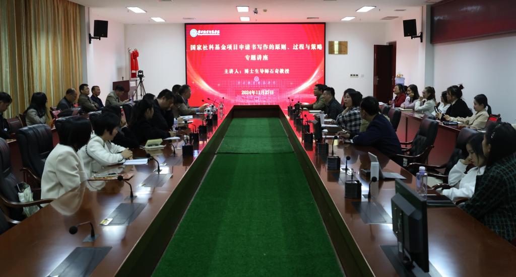 11月27日下午,国家社科基金项目申请书指导专题讲座在广西职业师范学院相思湖校区图文信息楼十三楼会议室举办,讲座以“国家社科基金项目申请书写作的原则、过程与策略”为主题。邀请浙江外国语学院、博士生导师石奇教授主讲,学校副校长梁君主持,学校教师代表50余人到会聆听。
