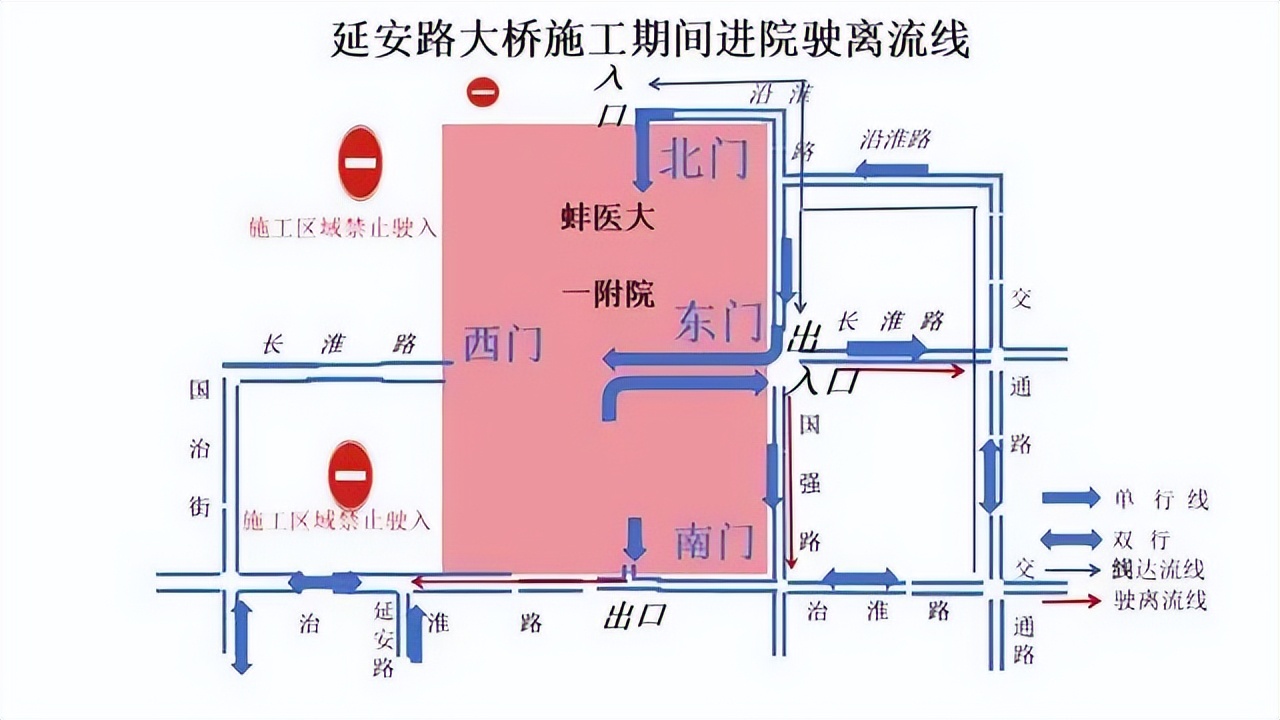 受蚌埠市延安路大桥施工影响,自12月1日起,延安路实行(治淮路—长淮路)封闭施工,蚌埠医科大学第一附属医院西门关闭。