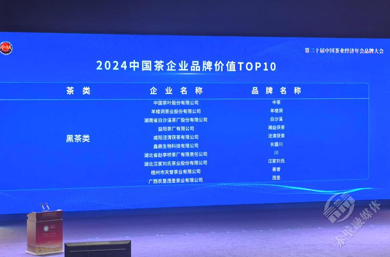 2024中国茶企业品牌价值排名top10(黑茶类),羊楼洞茶业股份有限公司的品牌羊楼洞排名第二,湖北省赵李桥茶厂有限责任公司的川字牌排名第七。