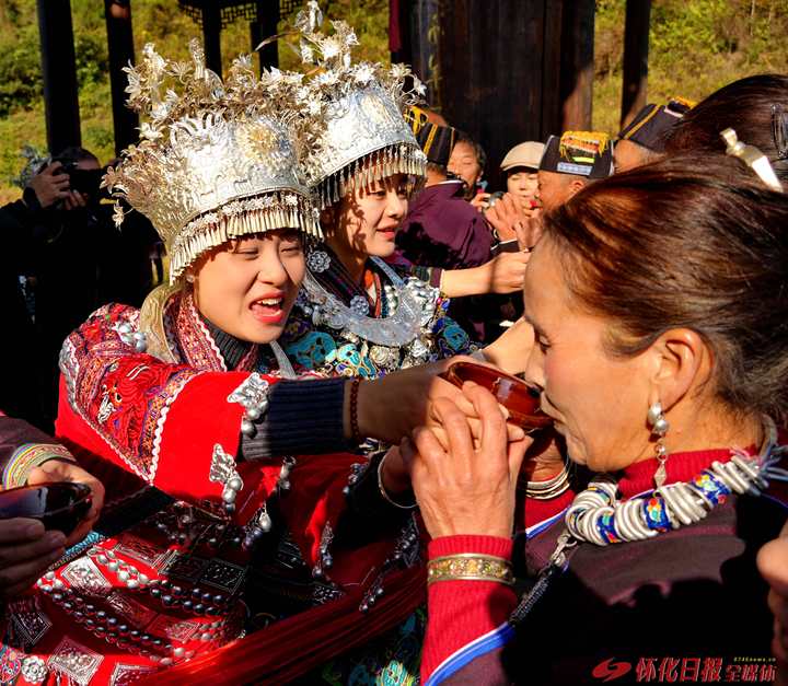 (侗族群众在岩脚侗寨寨门口邀请游客品尝拦门酒)