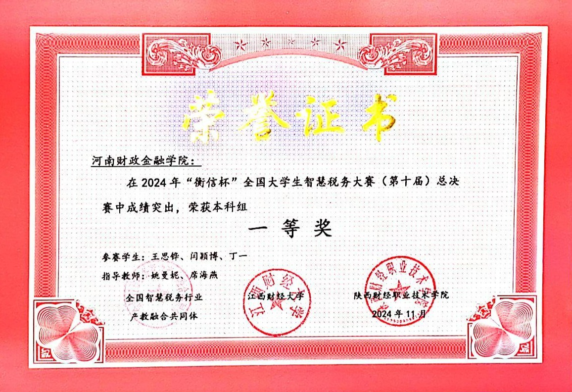 河南财政金融学院代表队在2024年“衡信杯”全国大学生智慧税务大赛总决赛中荣获一等奖