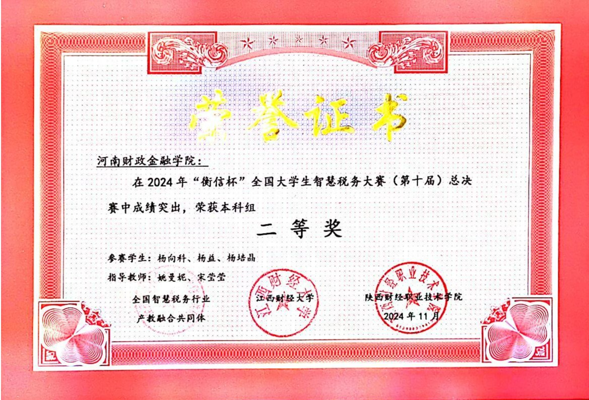 11月23日—24日,由中国税务学会、教育部《中国税制》课程虚拟教研室、江西省税务学会指导,全国智慧税务行业产教融合共同体、江西财经大学、陕西财经职业技术学院主办,浙江衡信教育科技有限公司技术支持的2024年衡信杯全国大学生智慧税务大赛(第十届)总决赛在江西财经大学举行。河南财政金融学院代表队取得自参加该项赛事以来的最好成绩,荣获大赛一等奖和二等奖。