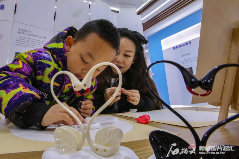 12月1日,家长陪同孩子在伊宁县英塔木镇夏合勒克塔木村的天鹅艺术馆做手工。
