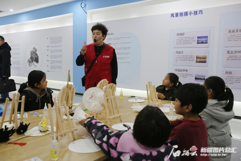 12月1日,工作人员在伊宁县英塔木镇夏合勒克塔木村的天鹅艺术馆讲解有关天鹅的保护知识。