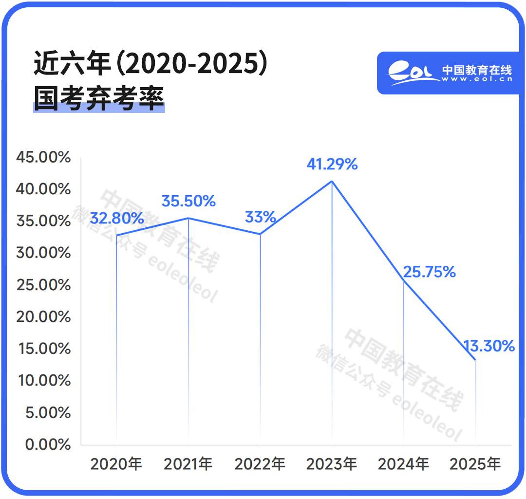 此外,相比前几年持续在25%以上的弃考率(放弃参加考试的人数与总报名人数之间的比例),本次国考的弃考率仅为13.3%!与去年的25.75%相比,显著下降!
