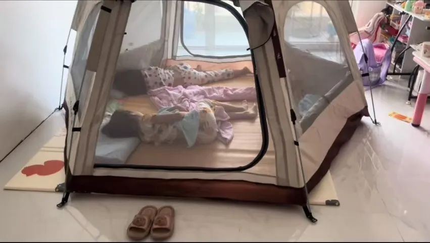 家里没有床,帐篷是我提前在网上买的。我寻思可以买一个大点的,就看中了一个2米4乘以2米4的帐篷,构想着里面不仅能容纳我们三个人睡觉,还可以放一个小桌子,白天她们能在里面吃饭。