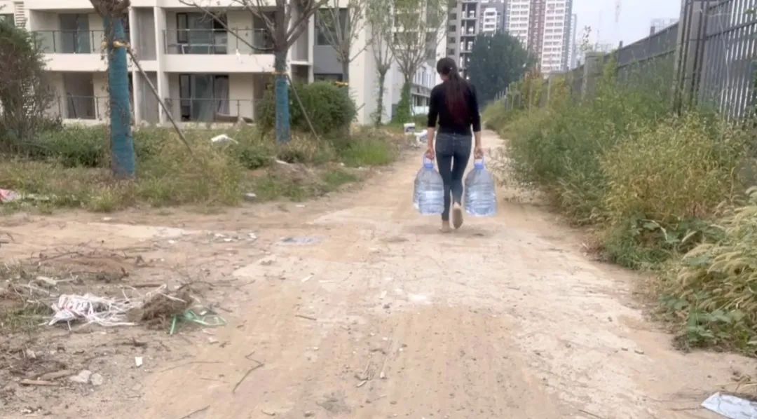 白天的很多功夫,我都要去外面找水。已经交付的那4栋楼下有绿化用水,刚开始,我会去那里洗菜、洗碗、洗头、洗衣服,再提几桶水上来。附近500米的地方有一个公园,我就去公园的公厕里上厕所。我给孩子们买了一个塑料的马桶,她们上学后,我也提着小马桶去公园刷一刷。