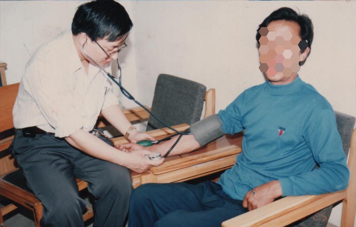 (1996年,第一例肾移植术后病人周先生(化名)康复14年,泌尿科主任王长安(左)为其做身体健康检查)