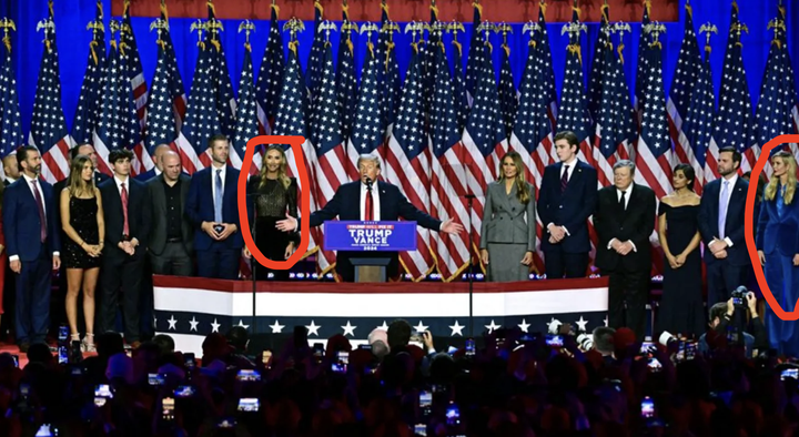 直到2024年大选特朗普的胜选演讲晚会上,身着深蓝色长裙的伊万卡才在舞台的边缘低调露面。相比于2016年,伊万卡的站位与特朗普更远了,衣着的颜色也更低调了。